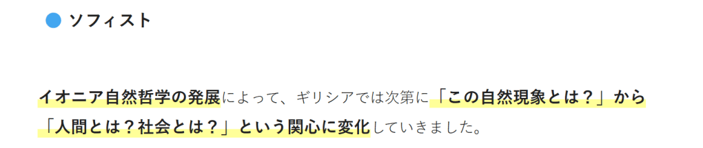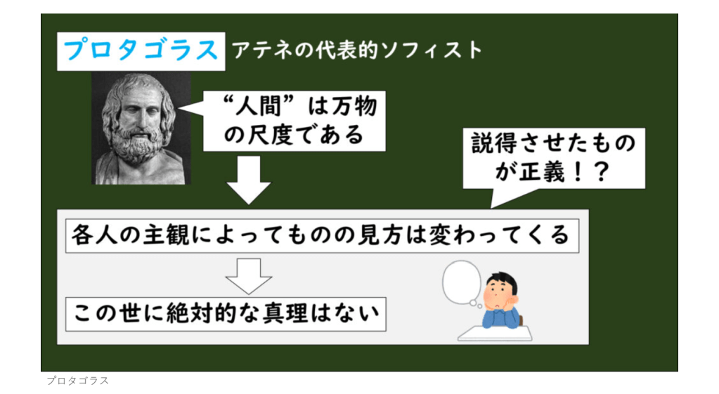 イオニア自然哲学の発展によって、ギリシアでは次第に「この自然現象とは?」から「人間とは?社会とは?」という関心に変化していきました。この頃からアテネでは、相手をいかに説得するかを教えるソフィストと呼ばれる職業が現れました。