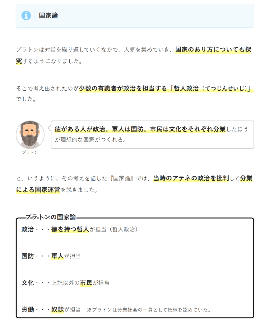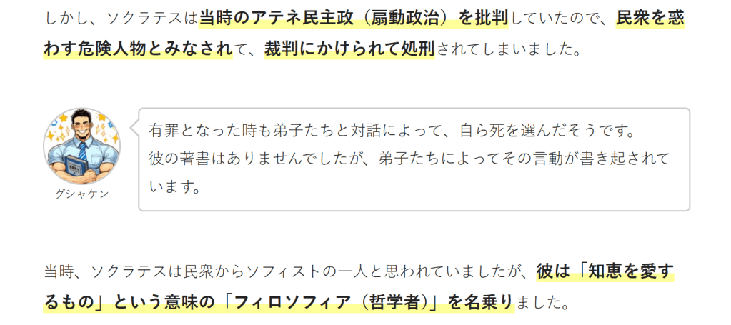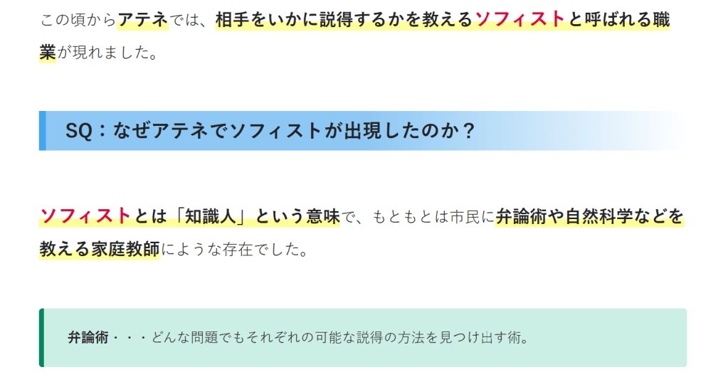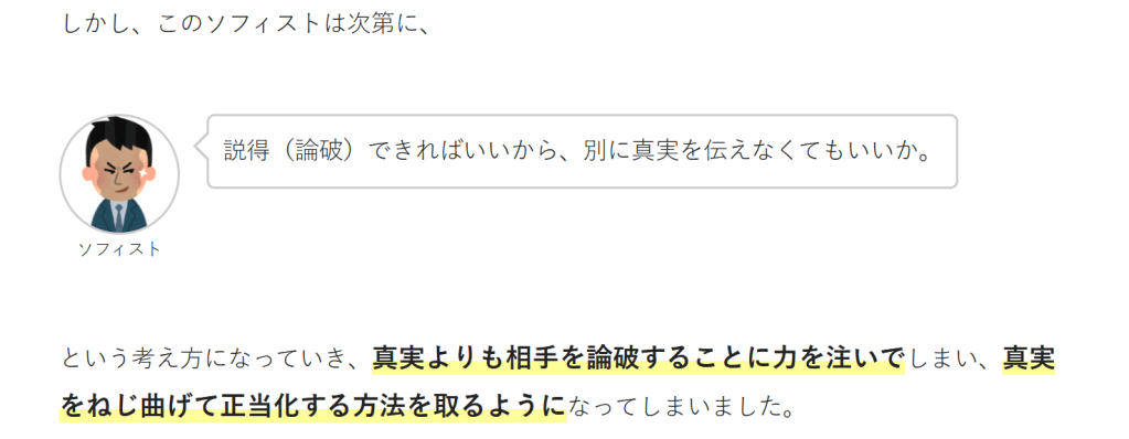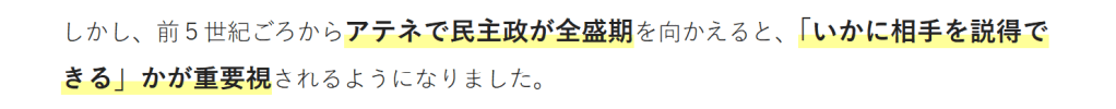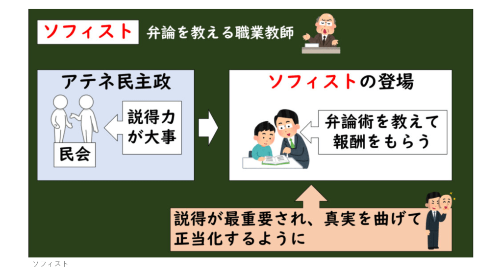 ソフィストとは「知識人」という意味で、もともとは市民に弁論術や自然科学などを教える家庭教師にような存在でした。弁論術・・・どんな問題でもそれぞれの可能な説得の方法を見つけ出す術。