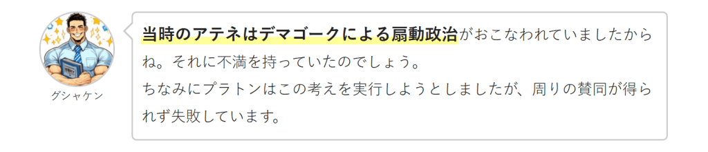 まずは、ギリシア人は市民団の意識が強かったので、常日頃から広場(アゴラ)に集まっては政治や社会のことについて議論をする習慣がありましたよね。