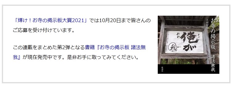 この連載をまとめた第2弾となる書籍『お寺の掲示板 諸法無我』が現在発売中です。是非お手に取ってみてください。』