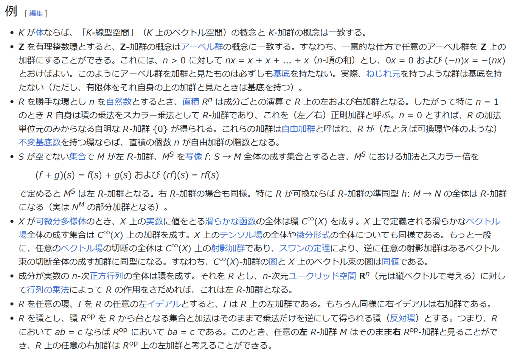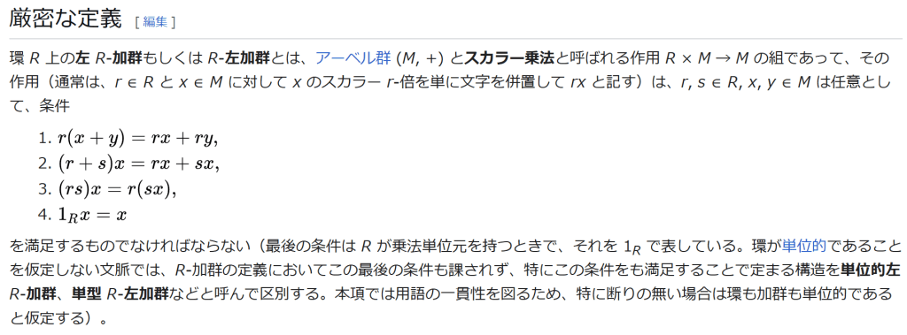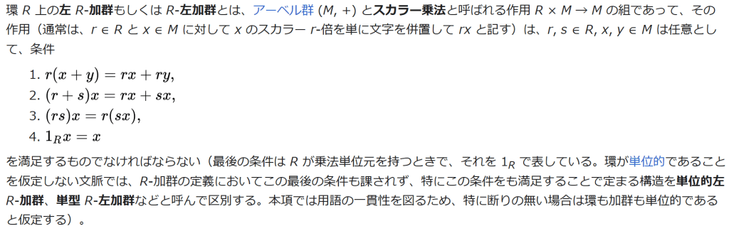 環 R 上の左 R-加群もしくは R-左加群とは、アーベル群 (M, +) とスカラー乗法と呼ばれる作用 R × M → M の組であって、その作用(通常は、r ∈ R と x ∈ M に対して x のスカラー r-倍を単に文字を併置して rx と記す)は、r, s ∈ R, x, y ∈ M は任意として、条件
