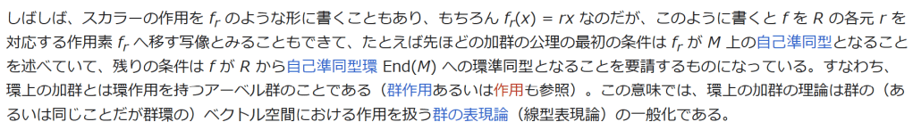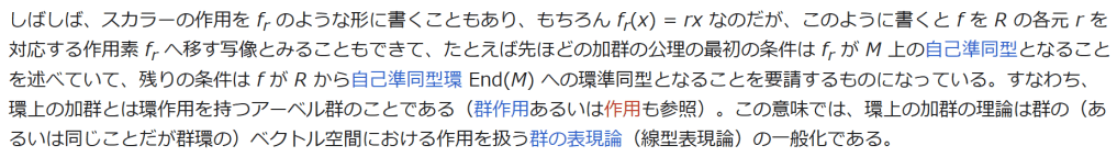 しばしば、スカラーの作用を fr のような形に書くこともあり、もちろん fr(x) = rx なのだが、このように書くと f を R の各元 r を対応する作用素 fr へ移す写像とみることもできて、たとえば先ほどの加群の公理の最初の条件は fr が M 上の自己準同型となることを述べていて、残りの条件は f が R から自己準同型環 End(M) への環準同型となることを要請するものになっている。