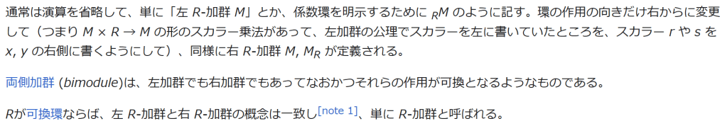 通常は演算を省略して、単に「左 R-加群 M」とか、係数環を明示するために RM のように記す。環の作用の向きだけ右からに変更して(つまり M × R → M の形のスカラー乗法があって、左加群の公理でスカラーを左に書いていたところを、スカラー r や s を x, y の右側に書くようにして)、同様に右 R-加群 M, MR が定義される。
