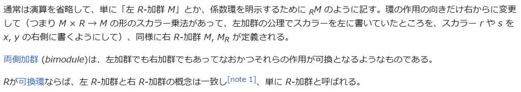 右 R-加群の場合も同様。特に R が可換ならば R-加群の準同型 h: M → N の全体は R-加群になる(実は NM の部分加群となる)。