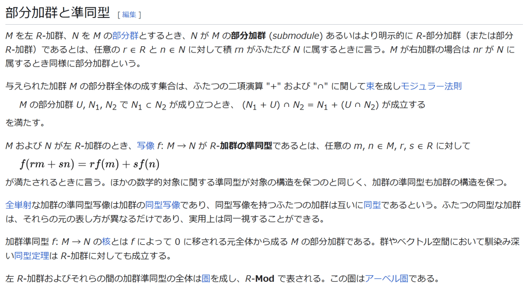 M および N が左 R-加群のとき、写像 f: M → N が R-加群の準同型であるとは、任意の m, n ∈ M, r, s ∈ R に対して