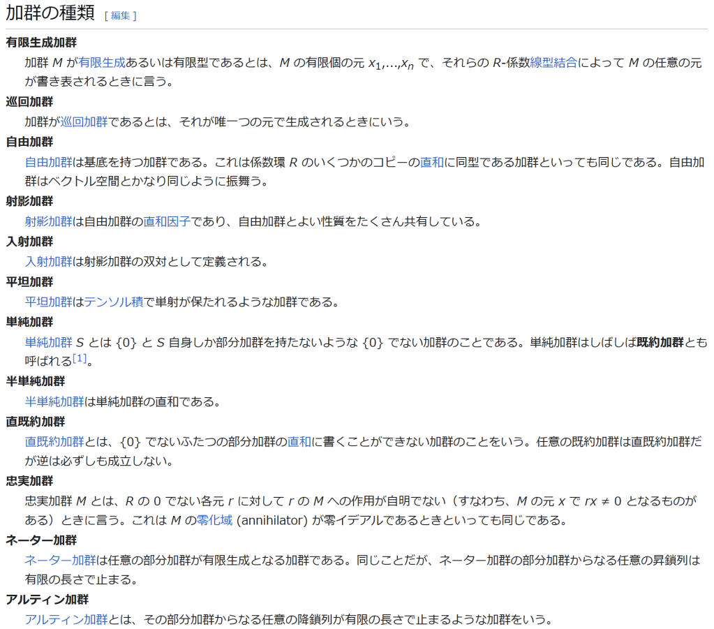有限生成加群 加群 M が有限生成あるいは有限型であるとは、M の有限個の元 x1,…,xn で、それらの R-係数線型結合によって M の任意の元が書き表されるときに言う。 巡回加群 加群が巡回加群であるとは、それが唯一つの元で生成されるときにいう。 自由加群 自由加群は基底を持つ加群である。これは係数環 R のいくつかのコピーの直和に同型である加群といっても同じである。自由加群はベクトル空間とかなり同じように振舞う。 射影加群 射影加群は自由加群の直和因子であり、自由加群とよい性質をたくさん共有している。 入射加群 入射加群は射影加群の双対として定義される。 平坦加群 平坦加群はテンソル積で単射が保たれるような加群である。 単純加群 単純加群 S とは {0} と S 自身しか部分加群を持たないような {0} でない加群のことである。単純加群はしばしば既約加群とも呼ばれる[1]。 半単純加群 半単純加群は単純加群の直和である。 直既約加群 直既約加群とは、{0} でないふたつの部分加群の直和に書くことができない加群のことをいう。任意の既約加群は直既約加群だが逆は必ずしも成立しない。 忠実加群 忠実加群 M とは、R の 0 でない各元 r に対して r の M への作用が自明でない(すなわち、M の元 x で rx ≠ 0 となるものがある)ときに言う。これは M の零化域 (annihilator) が零イデアルであるときといっても同じである。 ネーター加群 ネーター加群は任意の部分加群が有限生成となる加群である。同じことだが、ネーター加群の部分加群からなる任意の昇鎖列は有限の長さで止まる。 アルティン加群 アルティン加群とは、その部分加群からなる任意の降鎖列が有限の長さで止まるような加群をいう。 次数加群 次数付き加群とは、直和分解 M = ⊕x Mx を持つ、次数付き環 R = ⊕x Rx 上の加群であって、任意の添字 x, y に対して RxMy ⊂ Mx+y と成るようなものを言う。
