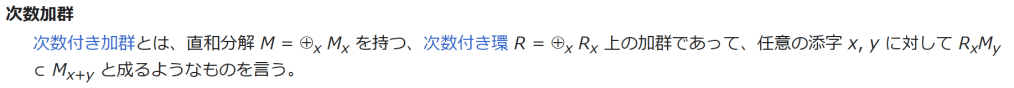 注釈 ^ これは少々紛らわしいが、任意の群環は係数環の中心上の群多元環となるから、その文脈で何を係数環としているかが明らかならば混乱の虞は無いであろう。 ^ 特に群 G が加法的に書かれている場合、群環における乗積表は eg⋅eh = eg+h から得られるが、群の元 g を生成元 eg と同一視する記法では、群の演算と群環の形式和の区別が紛らわしい。 出典 ^ Polcino Milies & Sehgal 2002, p.129 and 131. ^ a b Polcino Milies & Sehgal 2002, p. 131. 参考文献 Alperin, J. L.; Bell, Rowen B. (1995). Groups and Representations. Graduate Texts in Mathematics. 162. Springer-Verlag. doi:10.1007/978-1-4612-0799-3. ISBN 0-387-94525-3. MR1369573. Zbl 0839.20001 N. Bourbaki, Éléments de mathématique, Algèbre, chap. VIII Curtis, Charles W.; Reiner, I. (2006) [1962]. Representation Theory of Finite Groups and Associative Algebras. AMS Chelsea Publishing. doi:10.1090/chel/356. ISBN 0-8218-4066-5. MR2215618. Zbl 1093.20003 Hall, Marshall, Jr. [in 英語]. The Theory of Groups (英語). Lang, Serge. Algèbre. Passman, Donald S. (1985) [1977]. The Algebraic Structure of Group Rings. Robert E. Krieger Publishing. ISBN 0-89874-789-9. MR0798076. Zbl 0654.16001 Polcino Milies, C.; Sehgal, Sudarshan K. (2002). An Introduction to Group Rings. Kluwer Academic Publishers. doi:10.1007/978-94-010-0405-3. ISBN 1-4020-0238-6. MR1896125. Zbl 0997.20003 Serre, Jean-Pierre. Représentations linéaires des groupes finis. 関連項目 モノイド代数 フロベニウス代数 外部リンク A. A. Bovdi (2001), “Group algebra”, in Hazewinkel, Michiel, Encyclopedia of Mathematics, Springer, ISBN 978-1-55608-010-4 Weisstein, Eric W. “Group Ring”. mathworld.wolfram.com (英語). Barile, Margherita; Moslehian, Mohammad Sal; Weisstein, Eric W. “Group Algebra”. mathworld.wolfram.com (英語). group ring – PlanetMath.(英語) group algebra in nLab カテゴリ: 群の表現論調和解析多元環論数学に関する記事 最終更新 2021年10月12日 (火) 00:18 (日時は個人設定で未設定ならばUTC)。 テキストはクリエイティブ・コモンズ 表示-継承ライセンスのもとで利用できます。追加の条件が適用される場合があります。詳細については利用規約を参照してください。』