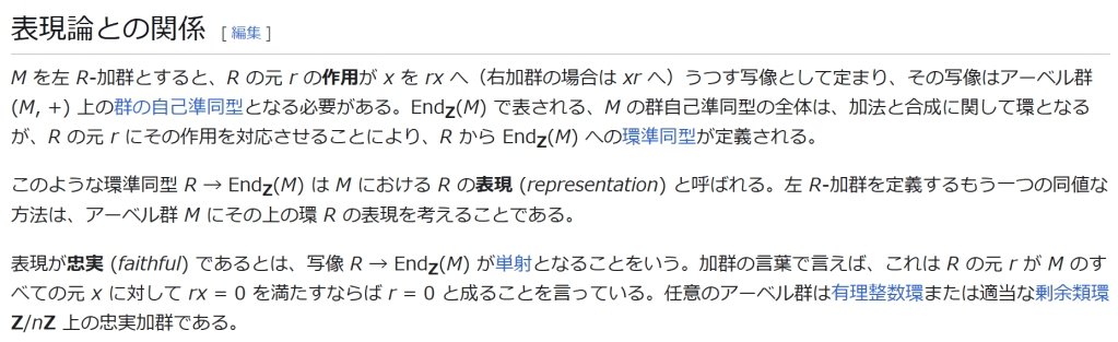 このような環準同型 R → EndZ(M) は M における R の表現 (representation) と呼ばれる。左 R-加群を定義するもう一つの同値な方法は、アーベル群 M にその上の環 R の表現を考えることである。