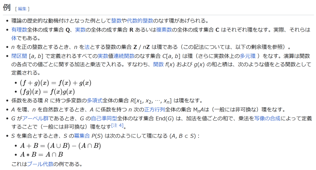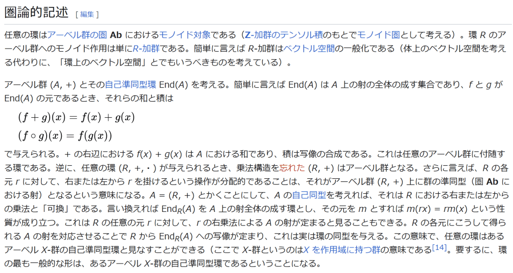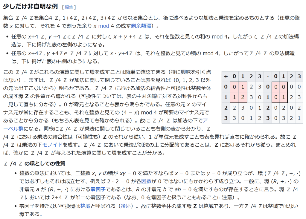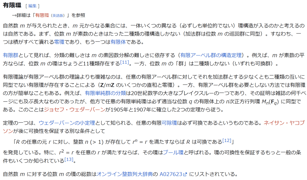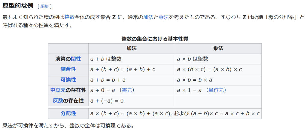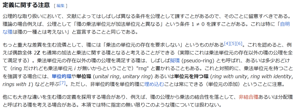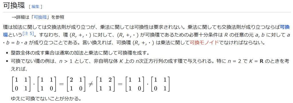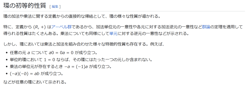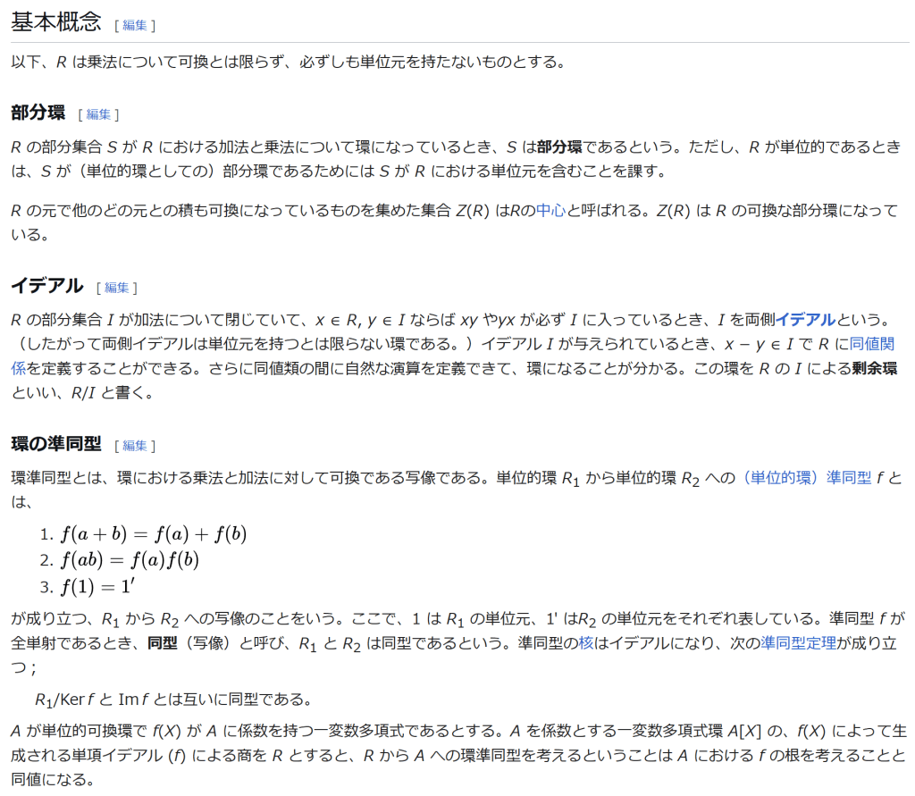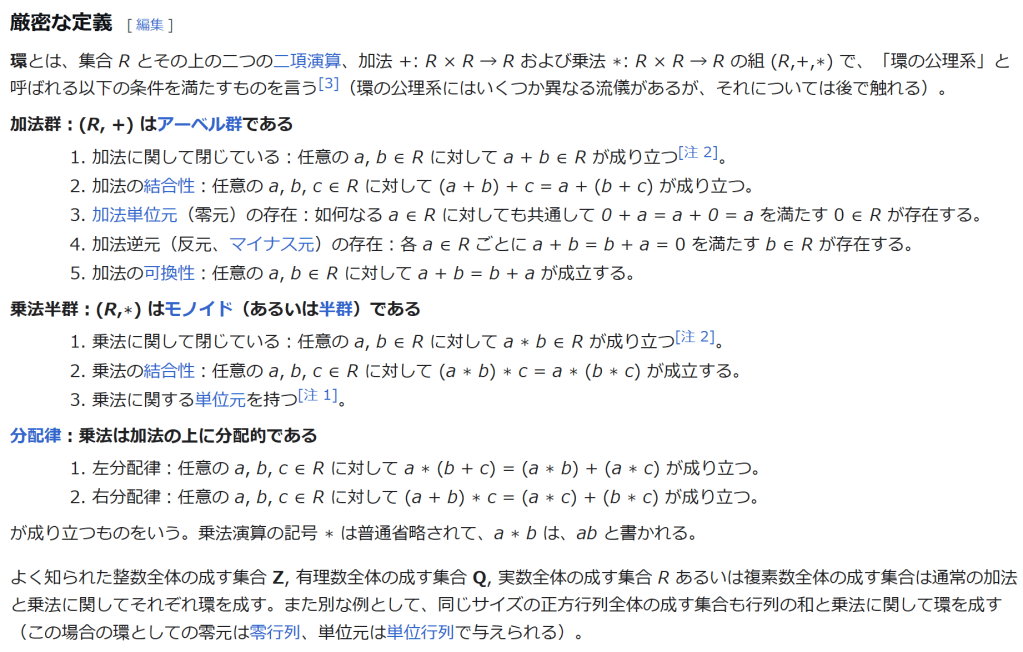 ^ a b 乗法に関しては半群となることのみを課す(乗法単位元の存在を要求しない)こともある。#定義に関する注意を参照 ^ a b 二項演算の定義に演算の閉性を含める場合も多く、その場合二項演算であるといった時点で閉性も出るから、特に断らないことも多い。 ^ 自明環の意味で「零環」という語を用いることもあるが、零環は一般に「任意の積が 0 に潰れている(擬)環」の意味でも用いるので、ここでは明確化のために自明環を零環と呼ぶのは避けておく。 ^ 逆に任意の環は適当なアーベル群の自己準同型環における部分環として実現できる[8]。これは群論におけるケイリーの定理の環論的類似である。 ^ 文献によっては、可換性まで環の公理に含めて、単に環といえば可換環のことを指しているという場合がある。 出典 ^ Herstein 1964, §3, p.83 ^ a b c d The development of Ring Theory ^ Herstein 1975, §2.1, p.27 ^ Herstein, I. N. Topics in Algebra, Wiley; 2 edition (June 20, 1975), ISBN 0-471-01090-1. ^ Joseph Gallian (2004), Contemporary Abstract Algebra, Houghton Mifflin, ISBN 9780618514717 ^ Neal H. McCoy (1964), The Theory of Rings, The MacMillian Company, p. 161, ISBN 978-1124045559 ^ Raymond Louis Wilder (1965), Introduction to Foundations of Mathematics, John Wiley and Sons, p. 176 ^ Anderson & Fuller 1992, p. 21. ^ Cohn, Harvey (1980), Advanced Number Theory, New York: Dover Publications, p. 49, ISBN 9780486640235 ^ Jacobson (2009), p. 86, footnote 1. ^ Fine, Benjamin (1993), “Classification of finite rings of order p2”, Math. Mag. 66: 248-252, doi:10.1080/0025570X.1993.11996133 ^ Jacobson 1945 ^ Pinter-Lucke 2007 ^ Jacobson (2009), p.162, Theorem 3.2. 関連文献 一般論についてのもの R.B.J.T. Allenby (1991), Rings, Fields and Groups, Butterworth-Heinemann, ISBN 0-340-54440-6 Anderson, Frank W.; Fuller, Kent R. (1992). Rings and Categories of Modules. Graduate Texts in Mathematics. 13 (Second ed.). Springer-Verlag. ISBN 0-387-97845-3. MR1245487. Zbl 0765.16001 Atiyah M. F., Macdonald, I. G., Introduction to commutative algebra. Addison-Wesley Publishing Co., Reading, Mass.-London-Don Mills, Ont. 1969 ix+128 pp. Beachy, J. A. Introductory Lectures on Rings and Modules. Cambridge, England: Cambridge University Press, 1999. T.S. Blyth and E.F. Robertson (1985), Groups, rings and fields: Algebra through practice, Book 3, Cambridge university Press, ISBN 0-521-27288-2 Dresden, G. “Small Rings.” [1] Ellis, G. Rings and Fields. Oxford, England: Oxford University Press, 1993. Goodearl, K. R., Warfield, R. B., Jr., An introduction to noncommutative Noetherian rings. London Mathematical Society Student Texts, 16. Cambridge University Press, Cambridge, 1989. xviii+303 pp. ISBN 0-521-36086-2 Herstein, I. N., Noncommutative rings. Reprint of the 1968 original. With an afterword by Lance W. Small. Carus Mathematical Monographs, 15. Mathematical Association of America, Washington, DC, 1994. xii+202 pp. ISBN 0-88385-015-X Jacobson, Nathan (2009), Basic algebra, 1 (2nd ed.), Dover, ISBN 978-0-486-47189-1 Nagell, T. “Moduls, Rings, and Fields.” §6 in Introduction to Number Theory. New York: Wiley, pp.19-21, 1951 Nathan Jacobson, Structure of rings. American Mathematical Society Colloquium Publications, Vol. 37. Revised edition American Mathematical Society, Providence, R.I. 1964 ix+299 pp. Nathan Jacobson, The Theory of Rings. American Mathematical Society Mathematical Surveys, vol. I. American Mathematical Society, New York, 1943. vi+150 pp. Kaplansky, Irving (1974), Commutative rings (Revised ed.), University of Chicago Press, ISBN 0226424545, MR0345945 Lam, T. Y., A first course in noncommutative rings. Second edition. Graduate Texts in Mathematics, 131. Springer-Verlag, New York, 2001. xx+385 pp. ISBN 0-387-95183-0 Lam, T. Y., Exercises in classical ring theory. Second edition. Problem Books in Mathematics. Springer-Verlag, New York, 2003. xx+359 pp. ISBN 0-387-00500-5 Lam, T. Y., Lectures on modules and rings. Graduate Texts in Mathematics, 189. Springer-Verlag, New York, 1999. xxiv+557 pp. ISBN 0-387-98428-3 Lang, Serge (2002), Algebra, Graduate Texts in Mathematics, 211 (Revised third ed.), New York: Springer-Verlag, ISBN 978-0-387-95385-4, Zbl 0984.00001, MR1878556 Lang, Serge (2005), Undergraduate Algebra (3rd ed.), Berlin, New York: Springer-Verlag, ISBN 978-0-387-22025-3. Matsumura, Hideyuki (1989), Commutative Ring Theory, Cambridge Studies in Advanced Mathematics (2nd ed.), Cambridge University Press, ISBN 978-0-521-36764-6 McConnell, J. C.; Robson, J. C. Noncommutative Noetherian rings. Revised edition. Graduate Studies in Mathematics, 30. American Mathematical Society, Providence, RI, 2001. xx+636 pp. ISBN 0-8218-2169-5 Pinter-Lucke, James (2007), “Commutativity conditions for rings: 1950–2005”, Expositiones Mathematicae 25 (2): 165-174, doi:10.1016/j.exmath.2006.07.001, ISSN 0723-0869 Rowen, Louis H., Ring theory. Vol. I, II. Pure and Applied Mathematics, 127, 128. Academic Press, Inc., Boston, MA, 1988. ISBN 0-12-599841-4, 0-12-599842-2 Sloane, N. J. A. Sequences A027623 and A037234 in “The On-Line Encyclopedia of Integer Sequences Zwillinger, D. (Ed.). “Rings.” §2.6.3 in CRC Standard Mathematical Tables and Formulae. Boca Raton, FL: CRC Press, pp.141-143, 1995 特定の話題に関するもの Balcerzyk, Stanisław; Józefiak, Tadeusz (1989), Commutative Noetherian and Krull rings, Ellis Horwood Series: Mathematics and its Applications, Chichester: Ellis Horwood Ltd., ISBN 978-0-13-155615-7 Balcerzyk, Stanisław; Józefiak, Tadeusz (1989), Dimension, multiplicity and homological methods, Ellis Horwood Series: Mathematics and its Applications., Chichester: Ellis Horwood Ltd., ISBN 978-0-13-155623-2 Ballieu, R. “Anneaux finis; systèmes hypercomplexes de rang trois sur un corps commutatif.” Ann. Soc