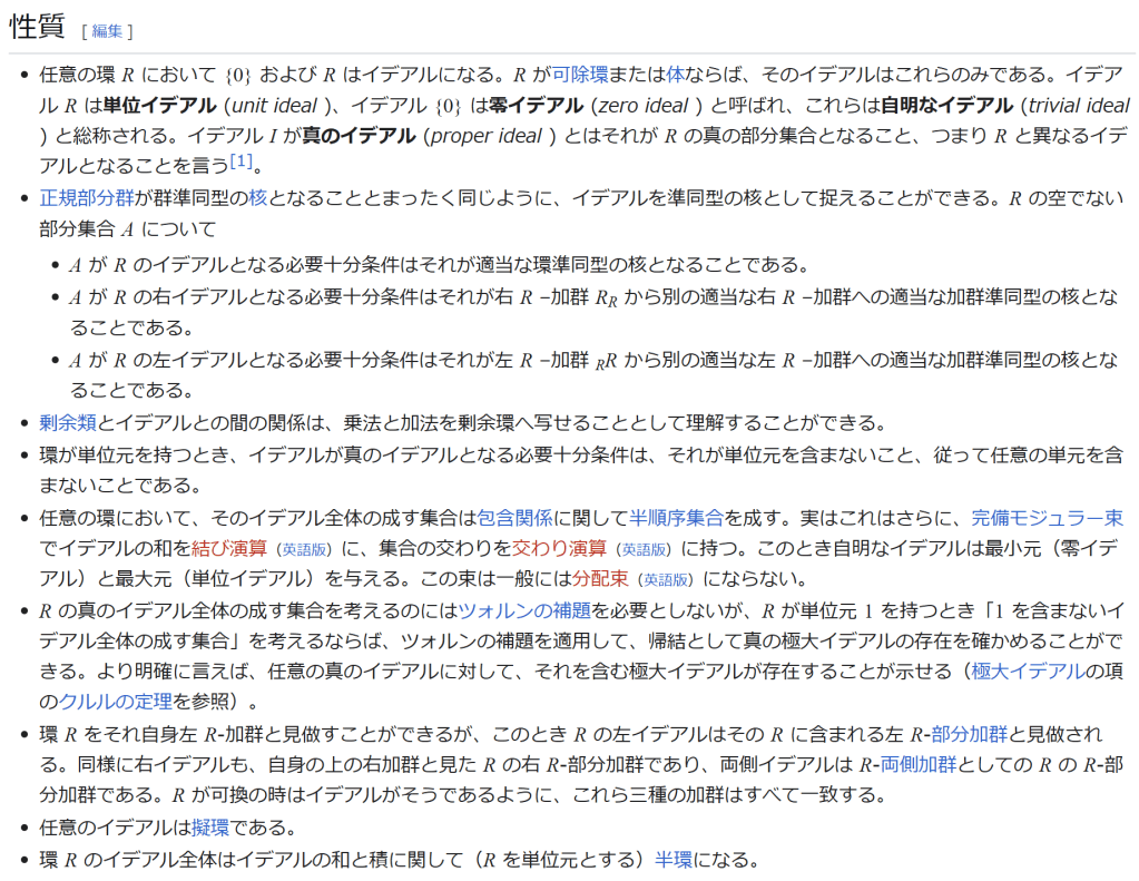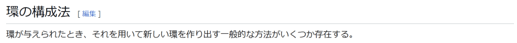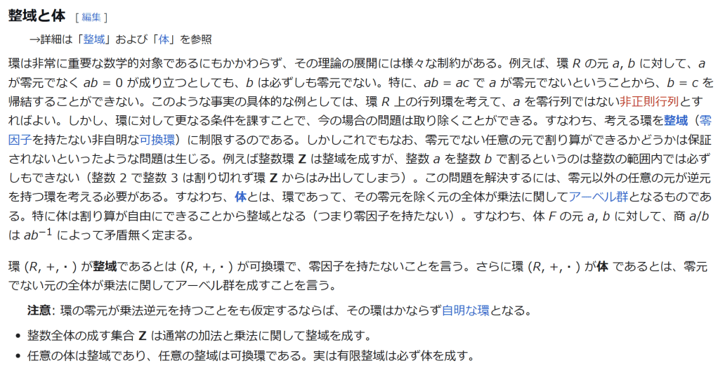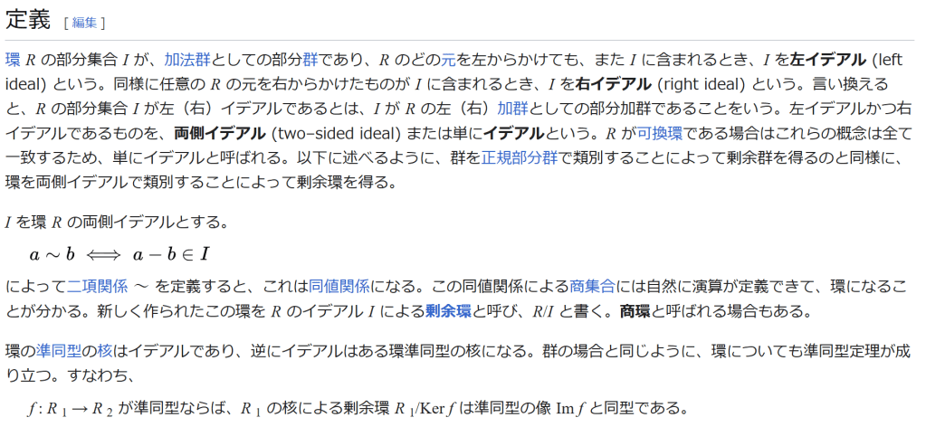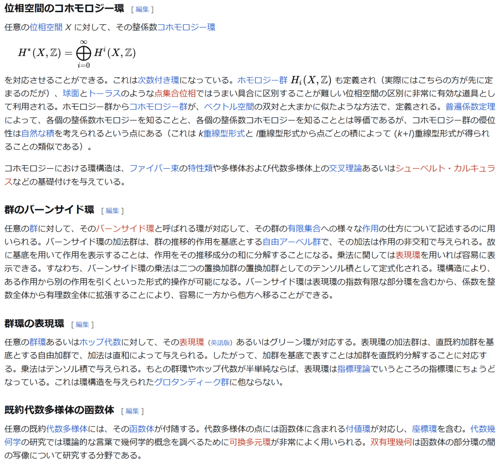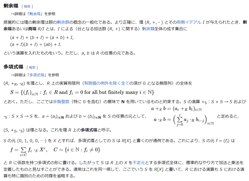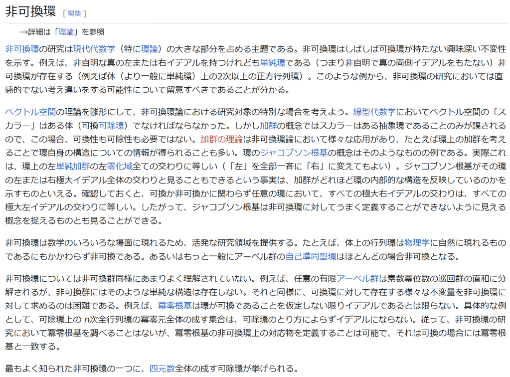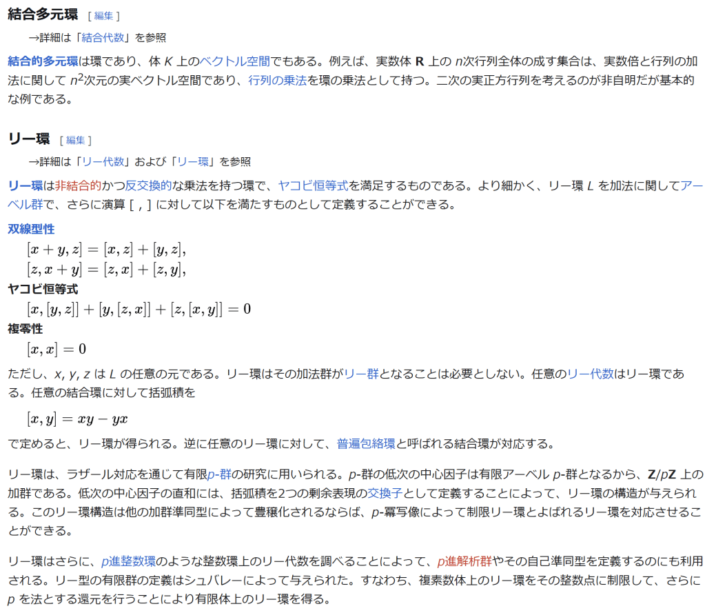 ^ a b 乗法に関しては半群となることのみを課す(乗法単位元の存在を要求しない)こともある。#定義に関する注意を参照 ^ a b 二項演算の定義に演算の閉性を含める場合も多く、その場合二項演算であるといった時点で閉性も出るから、特に断らないことも多い。 ^ 自明環の意味で「零環」という語を用いることもあるが、零環は一般に「任意の積が 0 に潰れている(擬)環」の意味でも用いるので、ここでは明確化のために自明環を零環と呼ぶのは避けておく。 ^ 逆に任意の環は適当なアーベル群の自己準同型環における部分環として実現できる[8]。これは群論におけるケイリーの定理の環論的類似である。 ^ 文献によっては、可換性まで環の公理に含めて、単に環といえば可換環のことを指しているという場合がある。 出典 ^ Herstein 1964, §3, p.83 ^ a b c d The development of Ring Theory ^ Herstein 1975, §2.1, p.27 ^ Herstein, I. N. Topics in Algebra, Wiley; 2 edition (June 20, 1975), ISBN 0-471-01090-1. ^ Joseph Gallian (2004), Contemporary Abstract Algebra, Houghton Mifflin, ISBN 9780618514717 ^ Neal H. McCoy (1964), The Theory of Rings, The MacMillian Company, p. 161, ISBN 978-1124045559 ^ Raymond Louis Wilder (1965), Introduction to Foundations of Mathematics, John Wiley and Sons, p. 176 ^ Anderson & Fuller 1992, p. 21. ^ Cohn, Harvey (1980), Advanced Number Theory, New York: Dover Publications, p. 49, ISBN 9780486640235 ^ Jacobson (2009), p. 86, footnote 1. ^ Fine, Benjamin (1993), “Classification of finite rings of order p2”, Math. Mag. 66: 248-252, doi:10.1080/0025570X.1993.11996133 ^ Jacobson 1945 ^ Pinter-Lucke 2007 ^ Jacobson (2009), p.162, Theorem 3.2. 関連文献 一般論についてのもの R.B.J.T. Allenby (1991), Rings, Fields and Groups, Butterworth-Heinemann, ISBN 0-340-54440-6 Anderson, Frank W.; Fuller, Kent R. (1992). Rings and Categories of Modules. Graduate Texts in Mathematics. 13 (Second ed.). Springer-Verlag. ISBN 0-387-97845-3. MR1245487. Zbl 0765.16001 Atiyah M. F., Macdonald, I. G., Introduction to commutative algebra. Addison-Wesley Publishing Co., Reading, Mass.-London-Don Mills, Ont. 1969 ix+128 pp. Beachy, J. A. Introductory Lectures on Rings and Modules. Cambridge, England: Cambridge University Press, 1999. T.S. Blyth and E.F. Robertson (1985), Groups, rings and fields: Algebra through practice, Book 3, Cambridge university Press, ISBN 0-521-27288-2 Dresden, G. “Small Rings.” [1] Ellis, G. Rings and Fields. Oxford, England: Oxford University Press, 1993. Goodearl, K. R., Warfield, R. B., Jr., An introduction to noncommutative Noetherian rings. London Mathematical Society Student Texts, 16. Cambridge University Press, Cambridge, 1989. xviii+303 pp. ISBN 0-521-36086-2 Herstein, I. N., Noncommutative rings. Reprint of the 1968 original. With an afterword by Lance W. Small. Carus Mathematical Monographs, 15. Mathematical Association of America, Washington, DC, 1994. xii+202 pp. ISBN 0-88385-015-X Jacobson, Nathan (2009), Basic algebra, 1 (2nd ed.), Dover, ISBN 978-0-486-47189-1 Nagell, T. “Moduls, Rings, and Fields.” §6 in Introduction to Number Theory. New York: Wiley, pp.19-21, 1951 Nathan Jacobson, Structure of rings. American Mathematical Society Colloquium Publications, Vol. 37. Revised edition American Mathematical Society, Providence, R.I. 1964 ix+299 pp. Nathan Jacobson, The Theory of Rings. American Mathematical Society Mathematical Surveys, vol. I. American Mathematical Society, New York, 1943. vi+150 pp. Kaplansky, Irving (1974), Commutative rings (Revised ed.), University of Chicago Press, ISBN 0226424545, MR0345945 Lam, T. Y., A first course in noncommutative rings. Second edition. Graduate Texts in Mathematics, 131. Springer-Verlag, New York, 2001. xx+385 pp. ISBN 0-387-95183-0 Lam, T. Y., Exercises in classical ring theory. Second edition. Problem Books in Mathematics. Springer-Verlag, New York, 2003. xx+359 pp. ISBN 0-387-00500-5 Lam, T. Y., Lectures on modules and rings. Graduate Texts in Mathematics, 189. Springer-Verlag, New York, 1999. xxiv+557 pp. ISBN 0-387-98428-3 Lang, Serge (2002), Algebra, Graduate Texts in Mathematics, 211 (Revised third ed.), New York: Springer-Verlag, ISBN 978-0-387-95385-4, Zbl 0984.00001, MR1878556 Lang, Serge (2005), Undergraduate Algebra (3rd ed.), Berlin, New York: Springer-Verlag, ISBN 978-0-387-22025-3. Matsumura, Hideyuki (1989), Commutative Ring Theory, Cambridge Studies in Advanced Mathematics (2nd ed.), Cambridge University Press, ISBN 978-0-521-36764-6 McConnell, J. C.; Robson, J. C. Noncommutative Noetherian rings. Revised edition. Graduate Studies in Mathematics, 30. American Mathematical Society, Providence, RI, 2001. xx+636 pp. ISBN 0-8218-2169-5 Pinter-Lucke, James (2007), “Commutativity conditions for rings: 1950–2005”, Expositiones Mathematicae 25 (2): 165-174, doi:10.1016/j.exmath.2006.07.001, ISSN 0723-0869 Rowen, Louis H., Ring theory. Vol. I, II. Pure and Applied Mathematics, 127, 128. Academic Press, Inc., Boston, MA, 1988. ISBN 0-12-599841-4, 0-12-599842-2 Sloane, N. J. A. Sequences A027623 and A037234 in “The On-Line Encyclopedia of Integer Sequences Zwillinger, D. (Ed.). “Rings.” §2.6.3 in CRC Standard Mathematical Tables and Formulae. Boca Raton, FL: CRC Press, pp.141-143, 1995 特定の話題に関するもの Balcerzyk, Stanisław; Józefiak, Tadeusz (1989), Commutative Noetherian and Krull rings, Ellis Horwood Series: Mathematics and its Applications, Chichester: Ellis Horwood Ltd., ISBN 978-0-13-155615-7 Balcerzyk, Stanisław; Józefiak, Tadeusz (1989), Dimension, multiplicity and homological methods, Ellis Horwood Series: Mathematics and its Applications., Chichester: Ellis Horwood Ltd., ISBN 978-0-13-155623-2 Ballieu, R. “Anneaux finis; systèmes hypercomplexes de rang trois sur un corps commutatif.” Ann. Soc