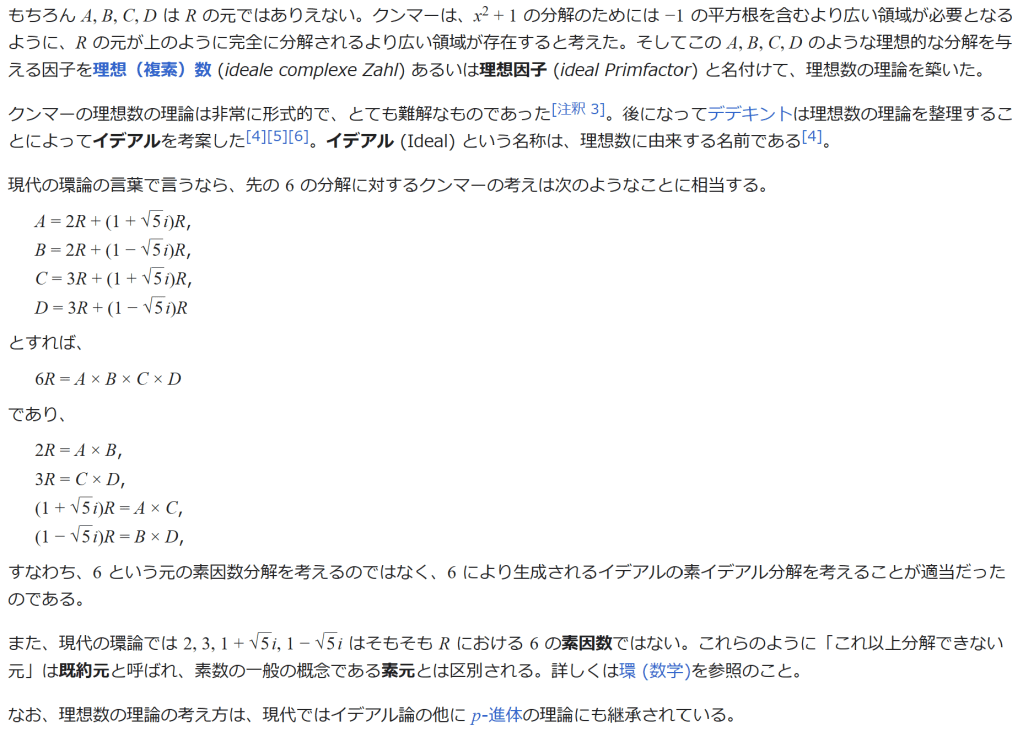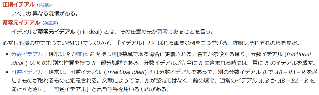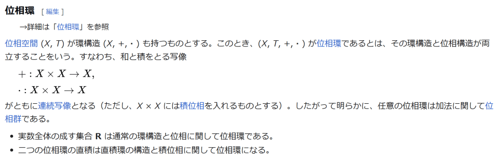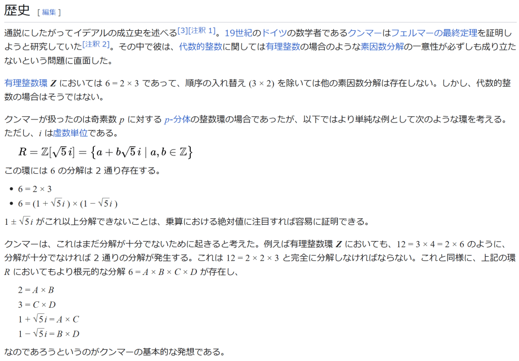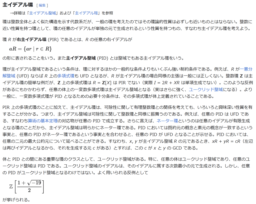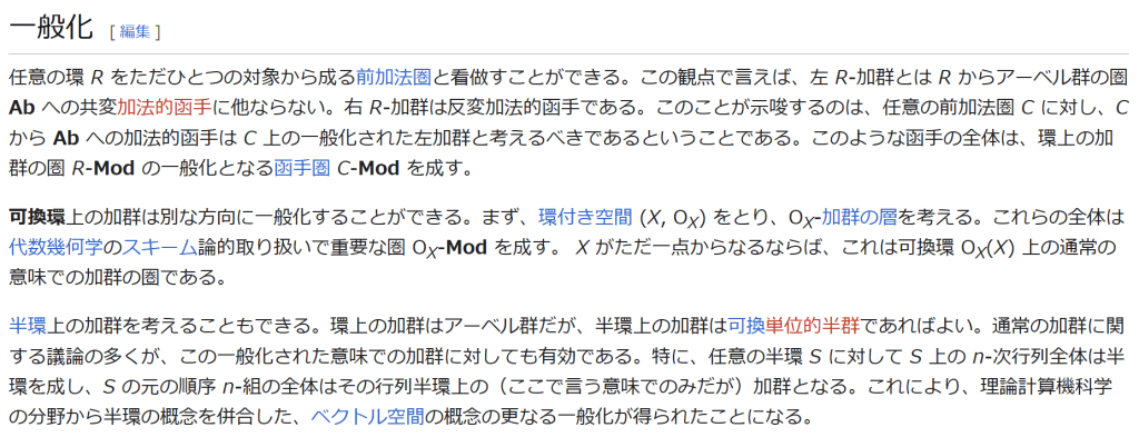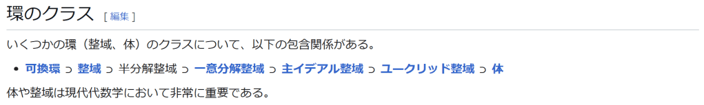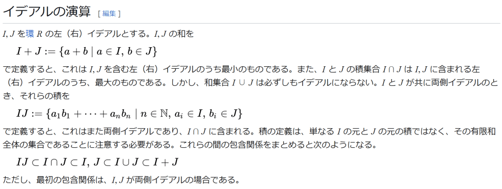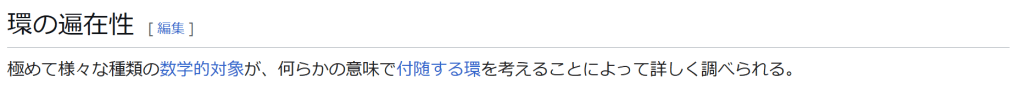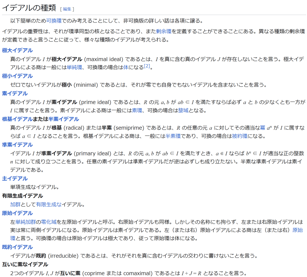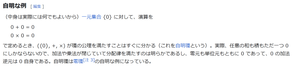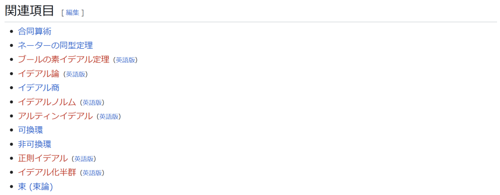 ^ a b 乗法に関しては半群となることのみを課す(乗法単位元の存在を要求しない)こともある。#定義に関する注意を参照 ^ a b 二項演算の定義に演算の閉性を含める場合も多く、その場合二項演算であるといった時点で閉性も出るから、特に断らないことも多い。 ^ 自明環の意味で「零環」という語を用いることもあるが、零環は一般に「任意の積が 0 に潰れている(擬)環」の意味でも用いるので、ここでは明確化のために自明環を零環と呼ぶのは避けておく。 ^ 逆に任意の環は適当なアーベル群の自己準同型環における部分環として実現できる[8]。これは群論におけるケイリーの定理の環論的類似である。 ^ 文献によっては、可換性まで環の公理に含めて、単に環といえば可換環のことを指しているという場合がある。 出典 ^ Herstein 1964, §3, p.83 ^ a b c d The development of Ring Theory ^ Herstein 1975, §2.1, p.27 ^ Herstein, I. N. Topics in Algebra, Wiley; 2 edition (June 20, 1975), ISBN 0-471-01090-1. ^ Joseph Gallian (2004), Contemporary Abstract Algebra, Houghton Mifflin, ISBN 9780618514717 ^ Neal H. McCoy (1964), The Theory of Rings, The MacMillian Company, p. 161, ISBN 978-1124045559 ^ Raymond Louis Wilder (1965), Introduction to Foundations of Mathematics, John Wiley and Sons, p. 176 ^ Anderson & Fuller 1992, p. 21. ^ Cohn, Harvey (1980), Advanced Number Theory, New York: Dover Publications, p. 49, ISBN 9780486640235 ^ Jacobson (2009), p. 86, footnote 1. ^ Fine, Benjamin (1993), “Classification of finite rings of order p2”, Math. Mag. 66: 248-252, doi:10.1080/0025570X.1993.11996133 ^ Jacobson 1945 ^ Pinter-Lucke 2007 ^ Jacobson (2009), p.162, Theorem 3.2. 関連文献 一般論についてのもの R.B.J.T. Allenby (1991), Rings, Fields and Groups, Butterworth-Heinemann, ISBN 0-340-54440-6 Anderson, Frank W.; Fuller, Kent R. (1992). Rings and Categories of Modules. Graduate Texts in Mathematics. 13 (Second ed.). Springer-Verlag. ISBN 0-387-97845-3. MR1245487. Zbl 0765.16001 Atiyah M. F., Macdonald, I. G., Introduction to commutative algebra. Addison-Wesley Publishing Co., Reading, Mass.-London-Don Mills, Ont. 1969 ix+128 pp. Beachy, J. A. Introductory Lectures on Rings and Modules. Cambridge, England: Cambridge University Press, 1999. T.S. Blyth and E.F. Robertson (1985), Groups, rings and fields: Algebra through practice, Book 3, Cambridge university Press, ISBN 0-521-27288-2 Dresden, G. “Small Rings.” [1] Ellis, G. Rings and Fields. Oxford, England: Oxford University Press, 1993. Goodearl, K. R., Warfield, R. B., Jr., An introduction to noncommutative Noetherian rings. London Mathematical Society Student Texts, 16. Cambridge University Press, Cambridge, 1989. xviii+303 pp. ISBN 0-521-36086-2 Herstein, I. N., Noncommutative rings. Reprint of the 1968 original. With an afterword by Lance W. Small. Carus Mathematical Monographs, 15. Mathematical Association of America, Washington, DC, 1994. xii+202 pp. ISBN 0-88385-015-X Jacobson, Nathan (2009), Basic algebra, 1 (2nd ed.), Dover, ISBN 978-0-486-47189-1 Nagell, T. “Moduls, Rings, and Fields.” §6 in Introduction to Number Theory. New York: Wiley, pp.19-21, 1951 Nathan Jacobson, Structure of rings. American Mathematical Society Colloquium Publications, Vol. 37. Revised edition American Mathematical Society, Providence, R.I. 1964 ix+299 pp. Nathan Jacobson, The Theory of Rings. American Mathematical Society Mathematical Surveys, vol. I. American Mathematical Society, New York, 1943. vi+150 pp. Kaplansky, Irving (1974), Commutative rings (Revised ed.), University of Chicago Press, ISBN 0226424545, MR0345945 Lam, T. Y., A first course in noncommutative rings. Second edition. Graduate Texts in Mathematics, 131. Springer-Verlag, New York, 2001. xx+385 pp. ISBN 0-387-95183-0 Lam, T. Y., Exercises in classical ring theory. Second edition. Problem Books in Mathematics. Springer-Verlag, New York, 2003. xx+359 pp. ISBN 0-387-00500-5 Lam, T. Y., Lectures on modules and rings. Graduate Texts in Mathematics, 189. Springer-Verlag, New York, 1999. xxiv+557 pp. ISBN 0-387-98428-3 Lang, Serge (2002), Algebra, Graduate Texts in Mathematics, 211 (Revised third ed.), New York: Springer-Verlag, ISBN 978-0-387-95385-4, Zbl 0984.00001, MR1878556 Lang, Serge (2005), Undergraduate Algebra (3rd ed.), Berlin, New York: Springer-Verlag, ISBN 978-0-387-22025-3. Matsumura, Hideyuki (1989), Commutative Ring Theory, Cambridge Studies in Advanced Mathematics (2nd ed.), Cambridge University Press, ISBN 978-0-521-36764-6 McConnell, J. C.; Robson, J. C. Noncommutative Noetherian rings. Revised edition. Graduate Studies in Mathematics, 30. American Mathematical Society, Providence, RI, 2001. xx+636 pp. ISBN 0-8218-2169-5 Pinter-Lucke, James (2007), “Commutativity conditions for rings: 1950–2005”, Expositiones Mathematicae 25 (2): 165-174, doi:10.1016/j.exmath.2006.07.001, ISSN 0723-0869 Rowen, Louis H., Ring theory. Vol. I, II. Pure and Applied Mathematics, 127, 128. Academic Press, Inc., Boston, MA, 1988. ISBN 0-12-599841-4, 0-12-599842-2 Sloane, N. J. A. Sequences A027623 and A037234 in “The On-Line Encyclopedia of Integer Sequences Zwillinger, D. (Ed.). “Rings.” §2.6.3 in CRC Standard Mathematical Tables and Formulae. Boca Raton, FL: CRC Press, pp.141-143, 1995 特定の話題に関するもの Balcerzyk, Stanisław; Józefiak, Tadeusz (1989), Commutative Noetherian and Krull rings, Ellis Horwood Series: Mathematics and its Applications, Chichester: Ellis Horwood Ltd., ISBN 978-0-13-155615-7 Balcerzyk, Stanisław; Józefiak, Tadeusz (1989), Dimension, multiplicity and homological methods, Ellis Horwood Series: Mathematics and its Applications., Chichester: Ellis Horwood Ltd., ISBN 978-0-13-155623-2 Ballieu, R. “Anneaux finis; systèmes hypercomplexes de rang trois sur un corps commutatif.” Ann. Soc