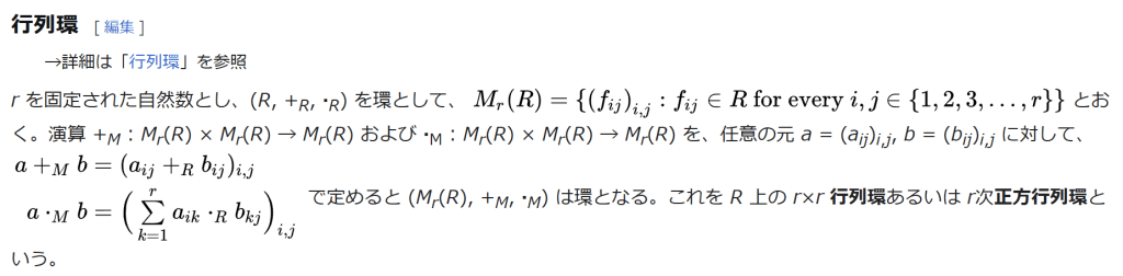成分が実数の n-次正方行列の全体は環を成す。