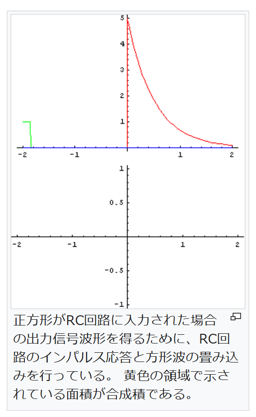 正方形がRC回路に入力された場合の出力信号波形を得るために、RC回路のインパルス応答と方形波の畳み込みを行っている。 黄色の領域で示されている面積が合成積である。 畳み込み(たたみこみ、英: convolution)とは、関数 g を平行移動しながら関数 f に重ね足し合わせる二項演算である。あるいはコンボリューションとも呼ばれる。