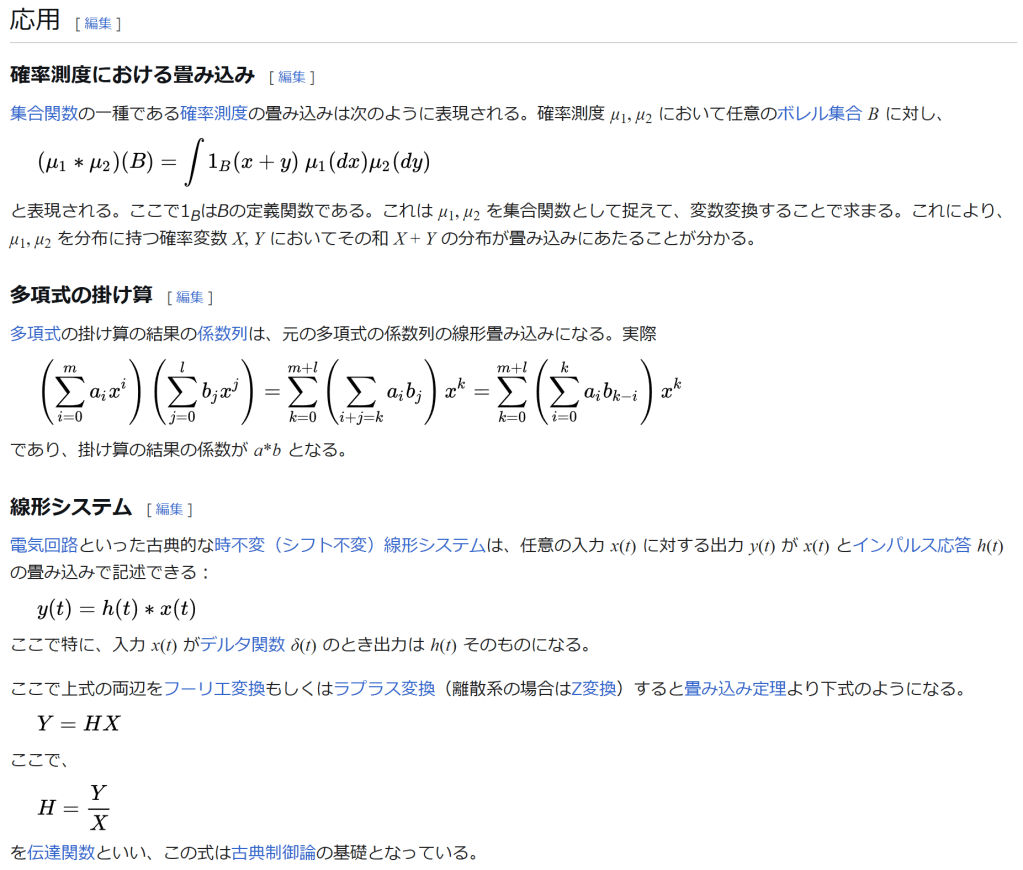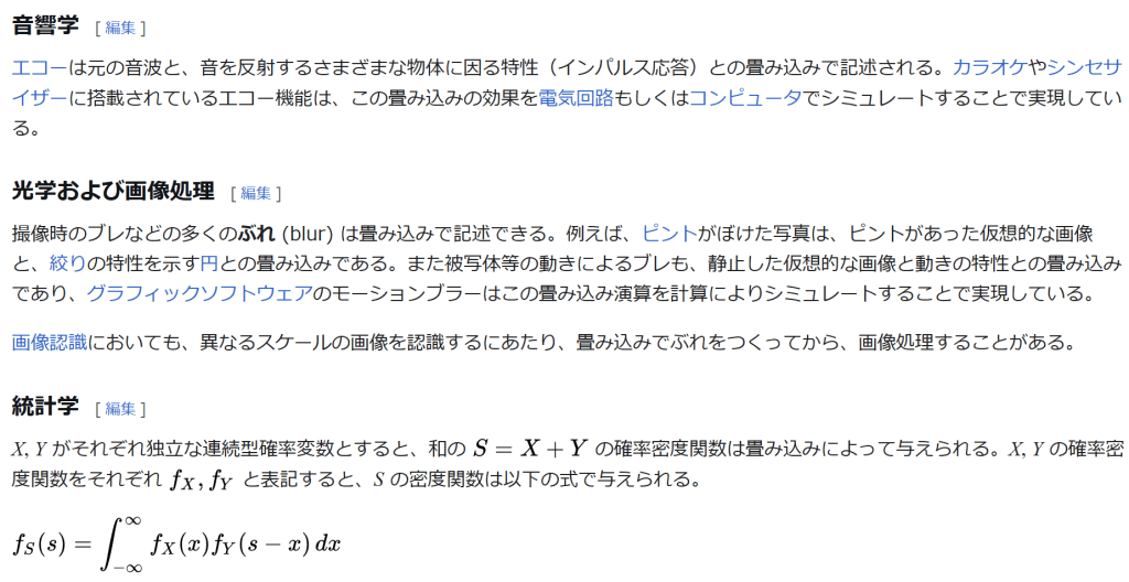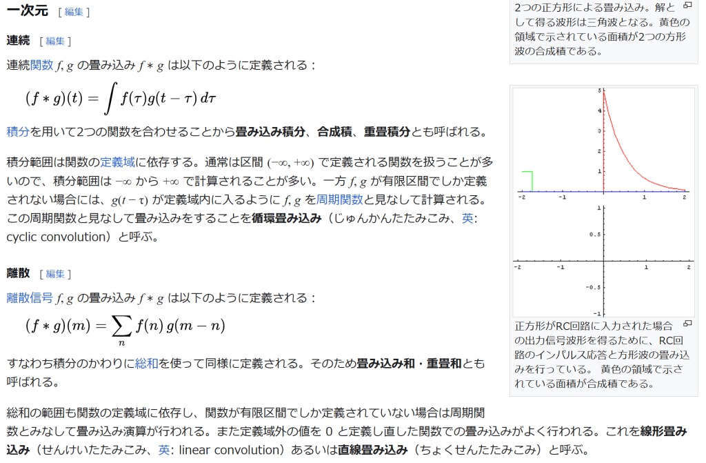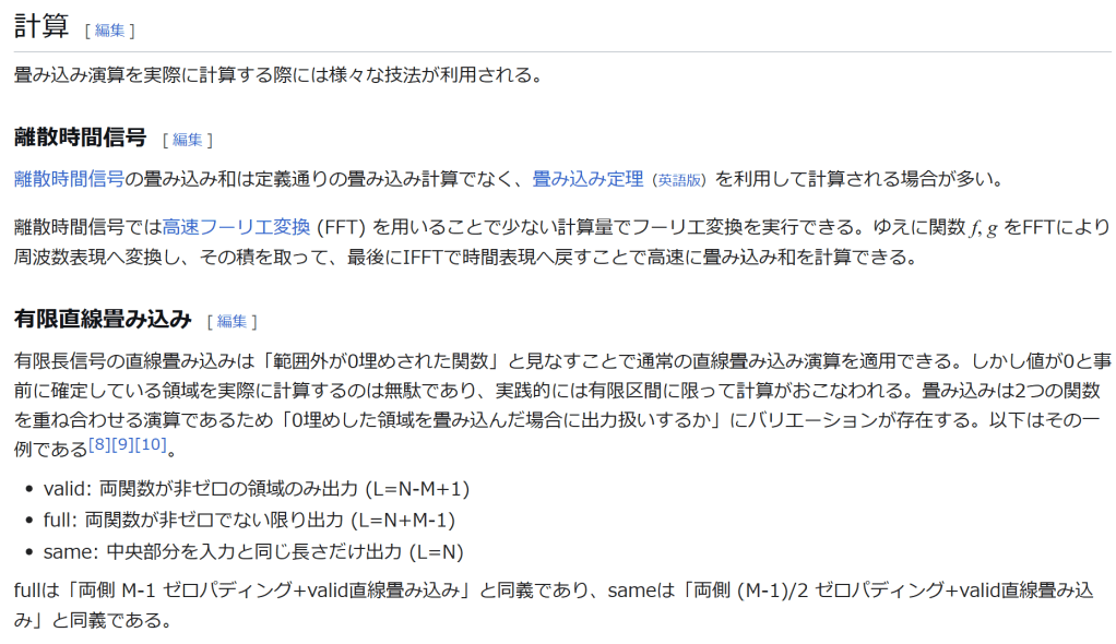 脚注 [脚注の使い方] 注釈 ^ 百科辞典シリーズ Traité du calcul différentiel et du calcul intégral, Chez Courcier, Paris, 1797-1800. の最後の三巻 出典 ^ Hörmander 1983, Chapter 1. ^ Stein & Weiss 1971, Theorem 1.3. ^ Beckner, William (1975), “Inequalities in Fourier analysis”, Ann. of Math. (2) 102: 159–182. Independently, Brascamp, Herm J. and Lieb, Elliott H. (1976), “Best constants in Young’s inequality, its converse, and its generalization to more than three functions”, Advances in Math. 20: 151–173. See Brascamp–Lieb inequality ^ Reed & Simon 1975, IX.4. ^ Stein & Weiss 1971, Theorem 3.3. ^ Hörmander 1983, §4.2. ^ Rudin 1962. ^ “mode : {‘full’, ‘valid’, ‘same’}” NumPy. numpy.convolve. NumPy v1.24 docs. 2023-03-23閲覧. ^ “mode : str {‘full’, ‘valid’, ‘same’}” SciPy. scipy.signal.convolve. NumPy v1.10.1 docs. 2023-03-23閲覧. ^ “mode (str, optional) – Must be one of (“full”, “valid”, “same”).” TorchAudio. TORCHAUDIO.FUNCTIONAL.CONVOLVE. TorchAudio 2.0.1 docs. 2023-03-23閲覧. ^ Dominguez-Torres 2010, p. 2. ^ Dominguez-Torres 2010, p. 4. ^ R. N. Bracewell (2005), “Early work on imaging theory in radio astronomy”, in W. T. Sullivan, The Early Years of Radio Astronomy: Reflections Fifty Years After Jansky’s Discovery, Cambridge University Press, p. 172, ISBN 978-0-521-61602-7 ^ John Hilton Grace and Alfred Young (1903), The algebra of invariants, Cambridge University Press, p. 40 ^ Leonard Eugene Dickson (1914), Algebraic invariants, J. Wiley, p. 85 ^ Lothar von Wolfersdorf (2000), “Einige Klassen quadratischer Integralgleichungen”, Sitzungsberichte der Sächsischen Akademie der Wissenschaften zu Leipzig, Mathematisch-naturwissenschaftliche Klasse, volume 128, number 2, 6–7 参考文献 Dominguez-Torres, Alejandro (Nov 2, 2010). “Origin and history of convolution”. 41 pgs. http://www.slideshare.net/Alexdfar/origin-adn-history-of-convolution. Cranfield, Bedford MK43 OAL, UK. Retrieved Mar 13, 2013. Hörmander, L. (1983), The analysis of linear partial differential operators I, Grundl. Math. Wissenschaft., 256, Springer, ISBN 3-540-12104-8, MR0717035 Stein, Elias; Weiss, Guido (1971), Introduction to Fourier Analysis on Euclidean Spaces, Princeton University Press, ISBN 0-691-08078-X Reed, Michael; Simon, Barry (1975), Methods of modern mathematical physics. II. Fourier analysis, self-adjointness, New York-London: Academic Press Harcourt Brace Jovanovich, Publishers, pp. xv+361, ISBN 0-12-585002-6, MR0493420 Rudin, Walter (1962), Fourier analysis on groups, Interscience Tracts in Pure and Applied Mathematics, No. 12, Interscience Publishers (a division of John Wiley and Sons), New York–London, ISBN 0-471-52364-X, MR0152834. 関連項目 逆畳み込み ブラインド・デコンボリューション インパルス応答 – 伝達関数 フーリエ変換 – ラプラス変換 軟化子 基本解 自己回帰移動平均モデル 巡回行列 アナログ信号処理 コーシー積 積和演算 外部リンク 『合成積(畳み込み)の意味と応用3つ』 – 高校数学の美しい物語 Weisstein, Eric W. “Convolution”. mathworld.wolfram.com (英語). convolution – PlanetMath.(英語) Hazewinkel, Michiel, ed. (2001), “Convolution of functions”, Encyclopedia of Mathematics, Springer, ISBN 978-1-55608-010-4 Hazewinkel, Michiel, ed. (2001), “Convolution transform”, Encyclopedia of Mathematics, Springer, ISBN 978-1-55608-010-4 The Joy of Convolution Java Applet を使った視覚的な畳み込みの説明 Examples of sampled impulse responses to be used in convolution reverbs (Fokke Van Saane) Examples of impulse responses synthesized from oscillator spectra, to be used in convolution reverbs (Emmanuel Deruty) BruteFIR; A software for applying long FIR filters to multi-channel digital audio, either offline or in realtime. Freeverb3 Reverb Impulse Response Processor: DSP library with convolution engines. 表話編歴 データ圧縮方式 可逆 エントロピー符号 一進法算術Asymmetric numeral systems(英語版)ゴロムハフマン 適応型(英語版)正準(英語版)MHレンジシャノンシャノン・ファノシャノン・ファノ・イライアス(英語版)タンストール(英語版)ユニバーサル(英語版) 指数ゴロム(英語版)フィボナッチ(英語版)ガンマデルタレーベンシュタイン(英語版) 辞書式(英語版) BPEDeflateLempel-Ziv LZ77LZ78LZFSELZHLZJB(英語版)LZMALZOLZRW(英語版)LZS(英語版)LZSSLZWLZWL(英語版)LZXLZ4ROLZ(英語版)統計型(英語版)BrotliSnappyZstandard その他 BWTCTW(英語版)DeltaDMC(英語版)MTFPAQPPMRLE 音声 理論 ビットレート 平均(ABR)固定(CBR)可変(VBR)コンパンディング畳み込みダイナミックレンジレイテンシ(英語版)標本化定理標本化音質音声符号化サブバンド符号化変換符号化知覚符号化 コーデック A-lawμ-lawACELPADPCMCELPDPCMフーリエ変換LPC LARLSPMDCT音響心理学WLPC 画像 理論 クロマサブサンプリング符号化ツリーユニット(英語版)色空間圧縮アーティファクト解像度マクロブロックピクセルPSNR量子化(英語版)標準テストイメージ(英語版) 手法 チェインコード(英語版)DCTEZW(英語版)フラクタルKLT(英語版)ピラミッド(英語版)RLESPIHT(英語版)ウェーブレット 映像 理論 ビットレート 平均(ABR)固定(CBR)可変(VBR)画面解像度フレームフレームレートインターレース映像品質(英語版) コーデック(英語版) 重複変換(英語版)DCTデブロッキングフィルタ(英語版)フレーム間予測 理論 情報量複雑性非可逆量子化レート歪み(英語版)冗長性情報理論の年表(英語版) カテゴリ: 関数解析学制御工学信号処理フーリエ解析双線型演算数学に関する記事 最終更新 2024年2月8日 (木) 09:52 (日時