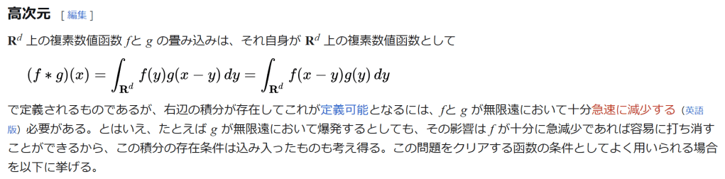 ∫ R d f ( x − y ) g ( y ) d y {\displaystyle (f*g)(x)=\int {\mathbf {R} ^{d}}f(y)g(x-y)\,dy=\int {\mathbf {R} ^{d}}f(x-y)g(y)\,dy} で定義されるものであるが、右辺の積分が存在してこれが定義可能となるには、fと g が無限遠において十分急速に減少する(英語版)必要がある。とはいえ、たとえば g が無限遠において爆発するとしても、その影響は f が十分に急減少であれば容易に打ち消すことができるから、この積分の存在条件は込み入ったものも考え得る。この問題をクリアする函数の条件としてよく用いられる場合を以下に挙げる。