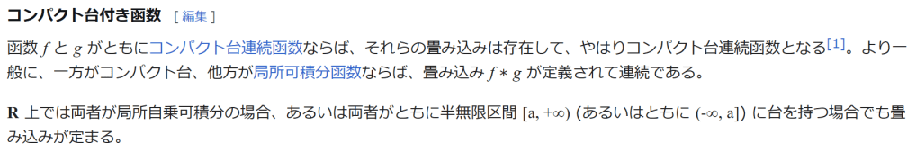 コンパクト台付き函数 函数 f と g がともにコンパクト台連続函数ならば、それらの畳み込みは存在して、やはりコンパクト台連続函数となる[1]。より一般に、一方がコンパクト台、他方が局所可積分函数ならば、畳み込み f ∗ g が定義されて連続である。