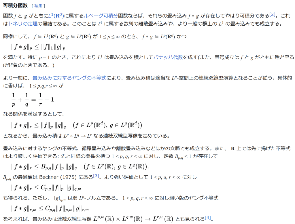 ‖ f ∗ g ‖ r ≤ ‖ f ‖ p ‖ g ‖ q ( f ∈ L p ( R d ) , g ∈ L q ( R d ) ) {\displaystyle \lVert f*g\rVert {r}\leq \lVert f\rVert {p}\,\lVert g\rVert _{q}\quad (f\in L^{p}(\mathbb {R} ^{d}),\,g\in L^{q}(\mathbb {R} ^{d}))} となるから、畳み込み積は Lp × Lq → Lr なる連続双線型写像を定めている。