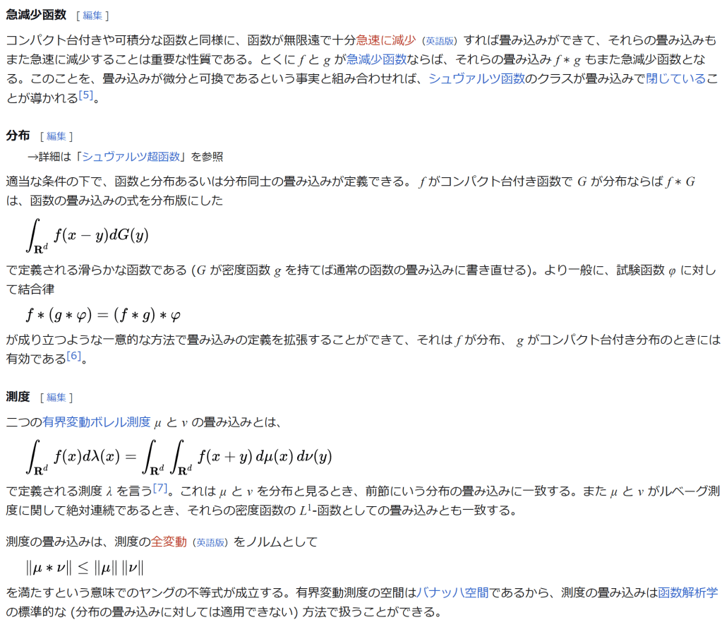 急減少函数 コンパクト台付きや可積分な函数と同様に、函数が無限遠で十分急速に減少(英語版)すれば畳み込みができて、それらの畳み込みもまた急速に減少することは重要な性質である。とくに f と g が急減少函数ならば、それらの畳み込み f ∗ g もまた急減少函数となる。このことを、畳み込みが微分と可換であるという事実と組み合わせれば、シュヴァルツ函数のクラスが畳み込みで閉じていることが導かれる[5]。