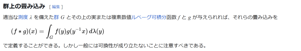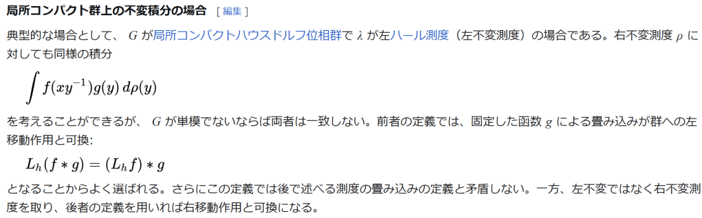 ∫ G f ( y ) g ( y − 1 x ) d λ ( y ) {\displaystyle (f*g)(x)=\int _{G}f(y)g(y^{-1}x)\,d\lambda (y)} で定義することができる。しかし一般には可換性が成り立たないことに注意すべきである。