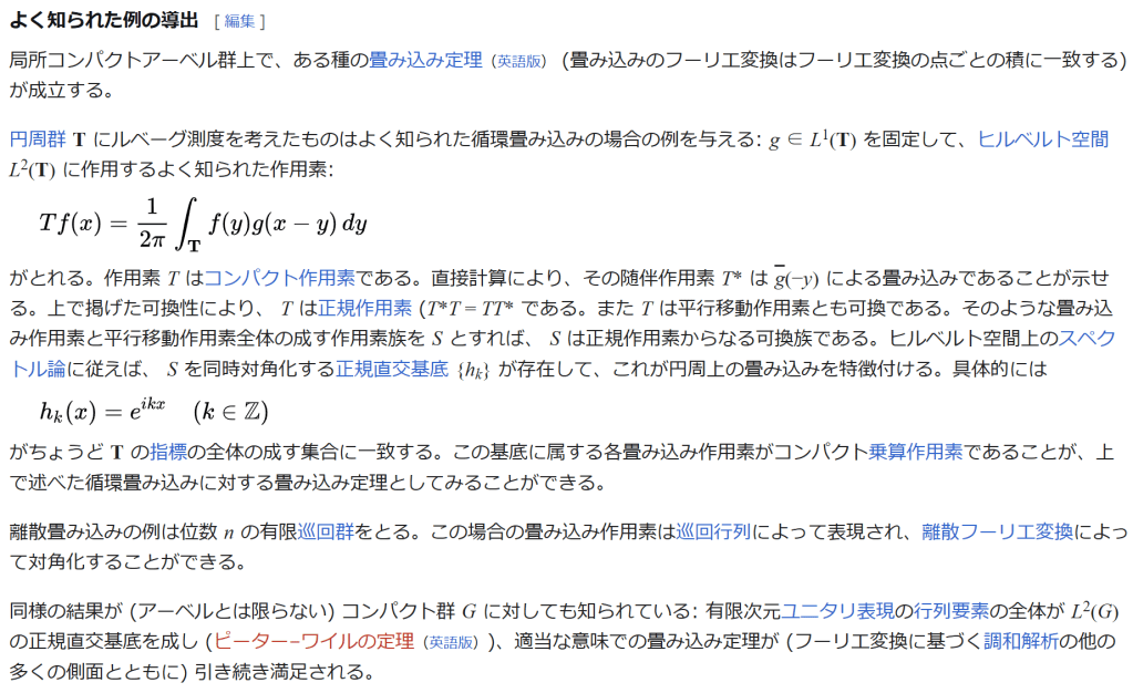 1 2 π ∫ T f ( y ) g ( x − y ) d y {\displaystyle T{f}(x)={\frac {1}{2\pi }}\int _{\mathbf {T} }{f}(y)g(x-y)\,dy} がとれる。作用素 T はコンパクト作用素である。直接計算により、その随伴作用素 T* は g(−y) による畳み込みであることが示せる。上で掲げた可換性により、 T は正規作用素 (TT = TT である。また T は平行移動作用素とも可換である。そのような畳み込み作用素と平行移動作用素全体の成す作用素族を S とすれば、 S は正規作用素からなる可換族である。ヒルベルト空間上のスペクトル論に従えば、 S を同時対角化する正規直交基底 {hk} が存在して、これが円周上の畳み込みを特徴付ける。具体的には