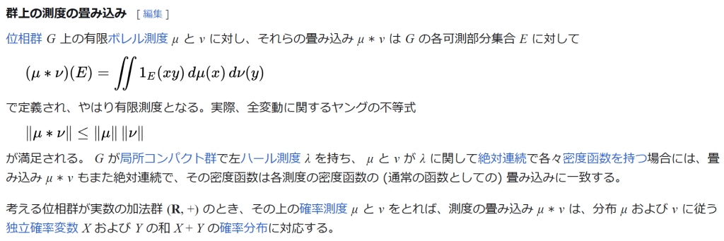 μ 1 ( d x ) μ 2 ( d y ) {\displaystyle (\mu {1}*\mu {2})(B)=\int 1_{B}(x+y)\ \mu {1}(dx)\mu {2}(dy)} と表現される。ここで1BはBの定義関数である。これは μ1, μ2 を集合関数として捉えて、変数変換することで求まる。これにより、μ1, μ2 を分布に持つ確率変数 X, Y においてその和 X + Y の分布が畳み込みにあたることが分かる。