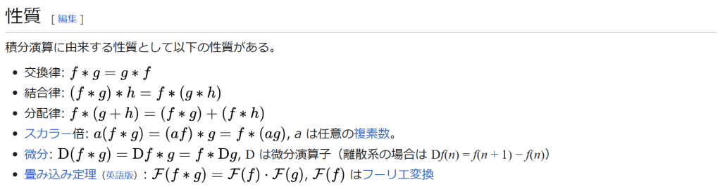 f ∗ D g {\displaystyle {\rm {D}}(fg)={\rm {D}}fg=f*{\rm {D}}g}, D は微分演算子(離散系の場合は Df(n) = f(n + 1) − f(n)) 畳み込み定理(英語版): F ( f ∗ g
