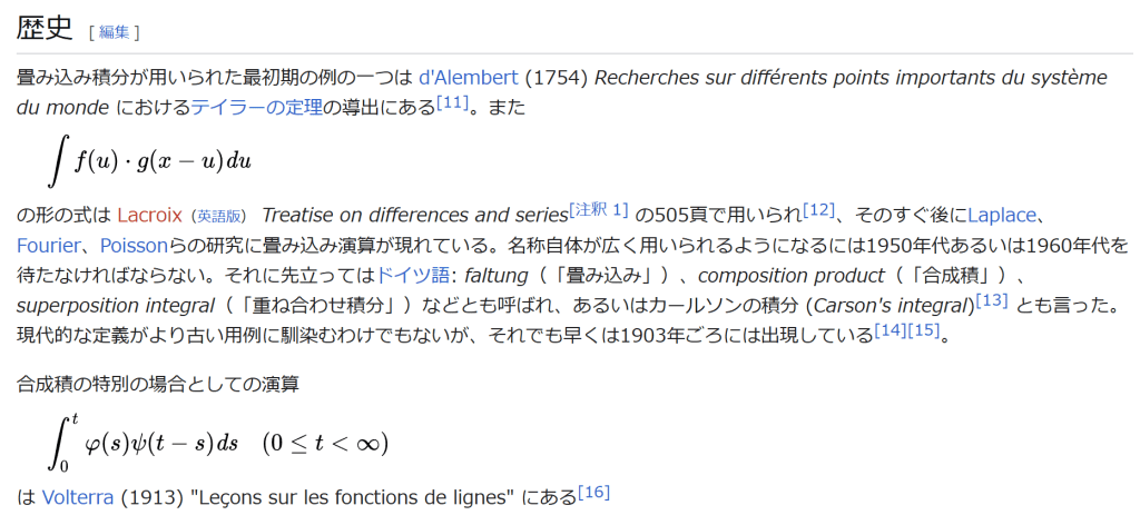 ∫ 0 t φ ( s ) ψ ( t − s ) d s ( 0 ≤ t < ∞ ) {\displaystyle \int _{0}^{t}\varphi (s)\psi (t-s){\mathit {ds}}\quad (0\leq t<\infty )} は Volterra (1913) “Leçons sur les fonctions de lignes” にある[16]