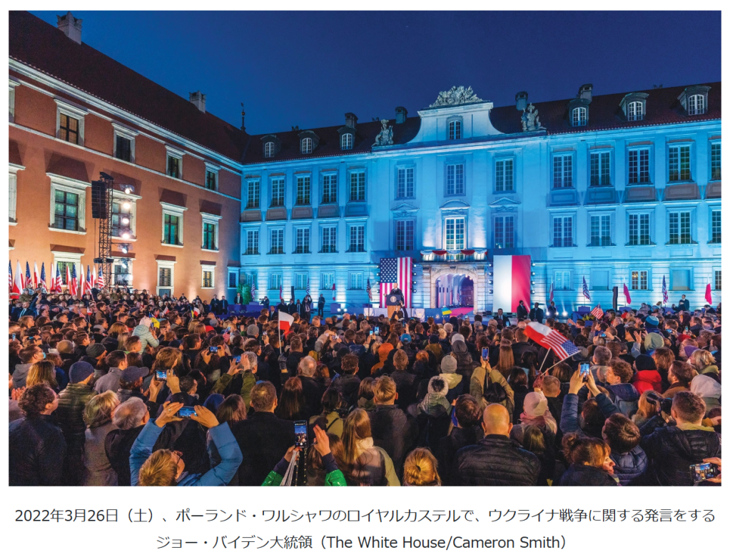 2022年3月26日(土)、ポーランド・ワルシャワのロイヤルカステルで、ウクライナ戦争に関する発言をするジョー・バイデン大統領(The White House/Cameron Smith)