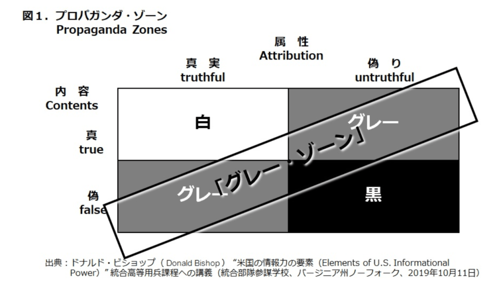 不正な情報の出所を偽の出所とするブラック・プロパガンダ(black propaganda)とは異なり、グレー・プロパガンダ(gray propaganda)は半分まことしやかな情報(semi-plausible information)の出所を出所不明で隠してしまうのである[9]。