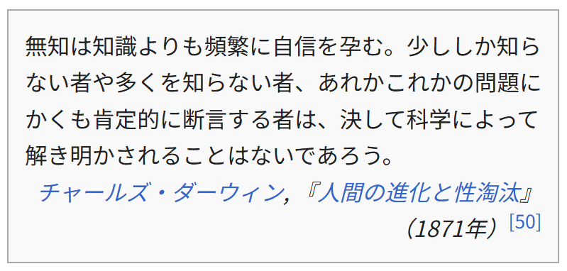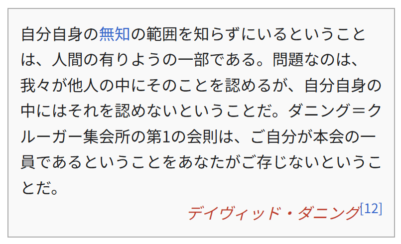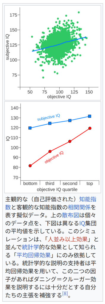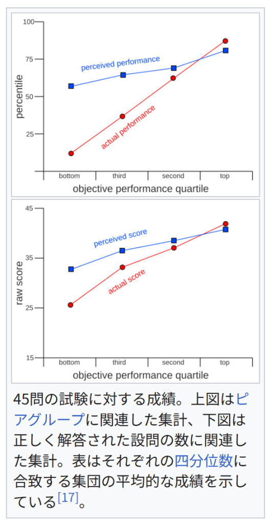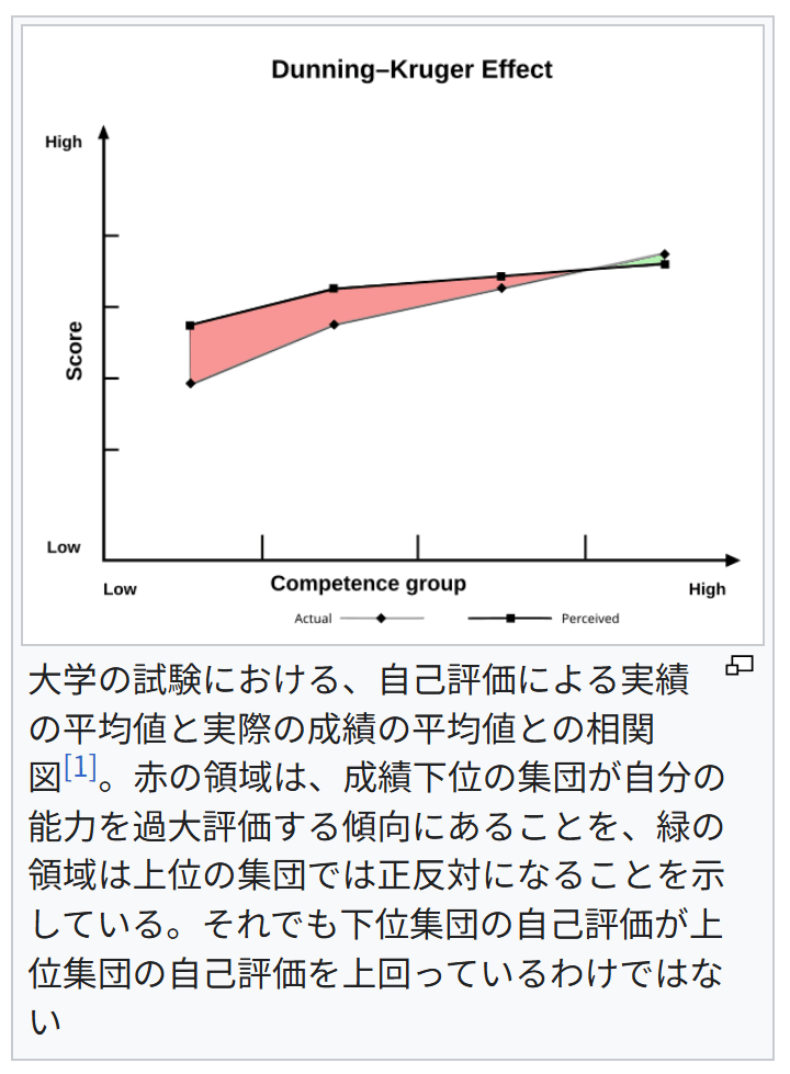 Dunning, David (27 October 2014). “We Are All Confident Idiots”. Pacific Standard (Miller-McCune Center for Research, Media, and Public Policy) 2014年10月28日閲覧。. Ackerman, Phillip L.; Beier, Margaret E.; Bowen, Kristy R. (1 September 2002). “What we really know about our abilities and our knowledge” (英語). Personality and Individual Differences 33 (4): 587–605. doi:10.1016/S0191-8869(01)00174-X. ISSN 0191-8869. オリジナルの26 July 2021時点におけるアーカイブ。 2021年7月26日閲覧。. Alicke, M. D.; Govorun, O. (2005). “The Better-Than-Average Effect.” (英語). The Self in Social Judgment. Psychology Press. p. 123. ISBN 9781841694184. オリジナルの24 December 2021時点におけるアーカイブ。 2021年12月24日閲覧。 Burson, Katherine A.; Larrick, Richard P.; Klayman, Joshua (2006). “Skilled or unskilled, but still unaware of it: How perceptions of difficulty drive miscalibration in relative comparisons”. Journal of Personality and Social Psychology 90 (1): 60–77. doi:10.1037/0022-3514.90.1.60. hdl:2027.42/39168. PMID 16448310. Colman, Andrew M. (1 January 2009). “false-consensus effect” (英語). A Dictionary of Psychology. Oxford University Press. ISBN 978-0-19-953406-7 “Dunning–Kruger effect” (英語). Encyclopedia Britannica (2023年). 2021年11月30日時点のオリジナルよりアーカイブ。2021年12月7日閲覧。 Dunning, David (1 January 2011). “Chapter Five – The Dunning–Kruger Effect: On Being Ignorant of One’s Own Ignorance” (英語). Advances in Experimental Social Psychology. 44. Academic Press. pp. 247–296. doi:10.1016/B978-0-12-385522-0.00005-6. ISBN 9780123855220 2021年12月20日閲覧。 Dunning, David; Helzer, Erik G. (2014). “Beyond the Correlation Coefficient in Studies of Self-Assessment Accuracy: Commentary on Zell & Krizan (2014)”. Perspectives on Psychological Science 9 (2): 126–130. doi:10.1177/1745691614521244. PMID 26173250. “The Dunning-Kruger effect and its discontents” (英語). British Psychological Association (2022年). 2023年11月29日閲覧。 Ehrlinger, Joyce; Dunning, David (January 2003). “How chronic self-views influence (and potentially mislead) estimates of performance”. Journal of Personality and Social Psychology 84 (1): 5–17. doi:10.1037/0022-3514.84.1.5. PMID 12518967. Ehrlinger, Joyce; Johnson, Kerri; Banner, Matthew; Dunning, David; Kruger, Justin (1 January 2008). “Why the Unskilled Are Unaware: Further Explorations of (Absent) Self-Insight Among the Incompetent”. Organizational Behavior and Human Decision Processes 105 (1): 98–121. doi:10.1016/j.obhdp.2007.05.002. ISSN 0749-5978. PMC 2702783. PMID 19568317. Gignac, Gilles E.; Zajenkowski, Marcin (1 May 2020). “The Dunning–Kruger effect is (mostly) a statistical artefact: Valid approaches to testing the hypothesis with individual differences data” (英語). Intelligence 80: 101449. doi:10.1016/j.intell.2020.101449. ISSN 0160-2896. オリジナルの15 May 2022時点におけるアーカイブ。 2021年12月20日閲覧。. Highhouse, Scott; Dalal, Reeshad S.; Salas, Eduardo (5 September 2013) (英語). Judgment and Decision Making at Work. Routledge. p. 55. ISBN 978-1-135-02194-8 IR staff (2006年8月). “Ig Nobel Past Winners”. Improbable Research. 2010年1月9日時点のオリジナルよりアーカイブ。2021年9月6日閲覧。 Jansen, Rachel A.; Rafferty, Anna N.; Griffiths, Thomas L. (25 February 2021). “A rational model of the Dunning–Kruger effect supports insensitivity to evidence in low performers”. Nature Human Behaviour 5 (6): 756–757. doi:10.1038/s41562-021-01057-0. PMID 33633375. Jarry, Jonathan (2020年12月17日). “The Dunning-Kruger Effect Is Probably Not Real”. McGill Office for Science and Society. McGill University. 2024年3月9日閲覧。 Kim, Young-Hoon; Kwon, Heewon; Chiu, Chi-Yue (2017). “The Better-Than-Average Effect Is Observed Because “Average” Is Often Construed as Below-Median Ability”. Frontiers in Psychology 8: 898. doi:10.3389/fpsyg.2017.00898. ISSN 1664-1078. PMC 5479883. PMID 28690555. Krajc, Marian; Ortmann, Andreas (1 November 2008). “Are the unskilled really that unaware? An alternative explanation” (英語). Journal of Economic Psychology 29 (5): 724–738. doi:10.1016/j.joep.2007.12.006. ISSN 0167-4870. オリジナルの23 January 2022時点におけるアーカイブ。 2021年12月24日閲覧。. Kruger, Justin; Dunning, David (1999). “Unskilled and Unaware of It: How Difficulties in Recognizing One’s Own Incompetence Lead to Inflated Self-Assessments”. Journal of Personality and Social Psychology 77 (6): 1121–1134. doi:10.1037/0022-3514.77.6.1121. PMID 10626367. Lee, Chris (2016年11月5日). “Revisiting why incompetents think they’re awesome” (英語). Ars Technica: p. 3. オリジナルの2019年12月19日時点におけるアーカイブ。 2014年1月11日閲覧。 Litvak, P.; Lerner, J. S. (2009). “Cognitive Bias”. The Oxford Companion to Emotion and the Affective Sciences. Oxford University Press. ISBN 9780198569633. オリジナルの2 November 2021時点におけるアーカイブ。 2021年12月20日閲覧。 Magnus, Jan R.; Peresetsky, Anatoly A. (25 March 2022). “A Statistical Explanation of the Dunning–Kruger Effect”. Frontiers in Psychology 13: 840180. doi:10.3389/fpsyg.2022.840180. PMC 8992690. PMID 35401341. Mahmood, Khalid (1 January 2016). “Do People Overestimate Their Information Literacy Skills? A Systematic Review of Empirical Evidence on the Dunning–Kruger Effect”. Communications in Information Literacy 10 (2): 199–213. doi:10.15760/comminfolit.2016.10.2.24. Mazor, Matan; Fleming, Stephen M. (June 2021). “The Dunning–Kruger effect revisited” (英語). Nature Human Behaviour 5 (6): 677–678. doi:10.1038/s41562-021-01101-z. ISSN 2397-3374. PMID 33833426. オリジナルの7 December 2021時点におけるアーカイブ。 2021年12