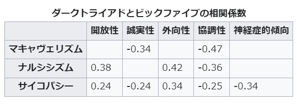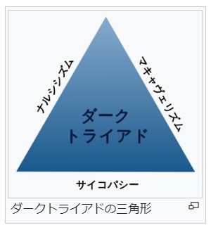反社会性パーソナリティ障害 悪 進化心理学 泥棒政治 Macdonald triad(英語版) Life history theory(英語版) 脚注 ^ Paulhus, D. L.; Williams, K.M. (2002). “The Dark Triad of Personality”. Journal of Research in Personality 36: 556–563. doi:10.1016/s0092-6566(02)00505-6. ^ Robert M. Regoli; John D. Hewitt; Matt DeLisi (20 April 2011). Delinquency in Society: The Essentials. Jones & Bartlett Learning. p. 99. ISBN 978-0-7637-7790-6 ^ W. Keith Campbell; Joshua D. Miller (7 July 2011). The Handbook of Narcissism and Narcissistic Personality Disorder: Theoretical Approaches, Empirical Findings, and Treatments. John Wiley & Sons. p. 154. ISBN 978-1-118-02924-4 ^ Mark R. Leary; Rick H. Hoyle (5 June 2009). Handbook of individual differences in social behavior. Guilford Press. p. 100. ISBN 978-1-59385-647-2 ^ Tomas Chamorro-Premuzic; Sophie von Stumm; Adrian Furnham (23 February 2011). The Wiley-Blackwell Handbook of Individual Differences. John Wiley & Sons. p. 527. ISBN 978-1-4443-4310-6 ^ Paulhus, D. L.; Williams, K. M. (2002). “The Dark Triad of personality: narcissism, Machiavellianism, and psychopathy”. Journal of Research in Personality 36 (6): 556–63. doi:10.1016/S0092-6566(02)00505-6. ^ Leonard M. Horowitz; Stephen Strack, Ph.D. (14 October 2010). Handbook of Interpersonal Psychology: Theory, Research, Assessment and Therapeutic Interventions. John Wiley & Sons. pp. 252–55. ISBN 978-0-470-88103-3 2012年2月15日閲覧。 ^ David Lacey (17 March 2009). Managing the Human Factor in Information Security: How to Win Over Staff and Influence Business Managers. John Wiley & Sons. p. 248. ISBN 978-0-470-72199-5 ^ Jones, D. N., Paulhus, D. L. (2010). “Differentiating the dark triad within the interpersonal circumplex”. In Horowitz, L. M.,; Strack, S. N.. Handbook of interpersonal theory and research. New York: Guilford. pp. 249–67 ^ Kohut, H. (1977). The Restoration of the Self. New York: International Universities Press ^ a b Jakobwitz, S.; Egan, V. (2006). “The ‘dark triad’ and normal personality traits”. Personality and Individual Differences 40 (2): 331–39. doi:10.1016/j.paid.2005.07.006. ^ Skeem, J. L.; Polaschek, D. L. L.; Patrick, C. J.; Lilienfeld, S. O. (2011). “Psychopathic Personality: Bridging the Gap Between Scientific Evidence and Public Policy”. Psychological Science in the Public Interest 12 (3): 95–162. doi:10.1177/1529100611426706. ^ McHoskey J. W.; Worzel W.; Szyarto C. (1998). “Machiavellianism and psychopathy”. Journal of Personality and Social Psychology 74 (1): 192–210. doi:10.1037/0022-3514.74.1.192. PMID 9457782. ^ a b c Paulhus, Delroy L; Williams, Kevin M (December 2002). “The Dark Triad of personality: Narcissism, Machiavellianism, and psychopathy”. Journal of Research in Personality 36 (6): 556–563. doi:10.1016/S0092-6566(02)00505-6. ^ a b c Jones, Daniel N.; Paulhus, Delroy L. (October 2011). “The role of impulsivity in the Dark Triad of personality”. Personality and Individual Differences 51 (5): 679–682. doi:10.1016/j.paid.2011.04.011. ^ Lynam, Donald R.; Gaughan, Eric T.; Miller, Joshua D.; Miller, Drew J.; Mullins-Sweatt, Stephanie; Widiger, Thomas A. (2011). “Assessing the basic traits associated with psychopathy: Development and validation of the Elemental Psychopathy Assessment.”. Psychological Assessment 23 (1): 108–124. doi:10.1037/a0021146. PMID 21171784. ^ Egan, Vincent; McCorkindale, Cara (December 2007). “Narcissism, vanity, personality and mating effort”. Personality and Individual Differences 43 (8): 2105–2115. doi:10.1016/j.paid.2007.06.034. ^ Jonason, Peter K.; Webster, Gregory D. (June 2010). “The dirty dozen: A concise measure of the dark triad.”. Psychological Assessment 22 (2): 420–432. doi:10.1037/a0019265. PMID 20528068. ^ Jones, Daniel N.; Paulhus, Delroy L. (9 December 2013). “Introducing the Short Dark Triad (SD3)”. Assessment 21 (1): 28–41. doi:10.1177/1073191113514105. PMID 24322012. ^ a b c O’Boyle, Ernest H.; Forsyth, Donelson R.; Banks, George C.; McDaniel, Michael A. (2012). “A meta-analysis of the Dark Triad and work behavior: A social exchange perspective.”. Journal of Applied Psychology 97 (3): 557–579. doi:10.1037/a0025679. PMID 22023075. ^ a b c d e f g h i j k l Furnham, Adrian; Richards, Steven C.; Paulhus, Delroy L. (March 2013). “The Dark Triad of Personality: A 10 Year Review”. Social and Personality Psychology Compass 7 (3): 199–216. doi:10.1111/spc3.12018 2019年7月20日閲覧。. ^ a b c d e f Vernon, Philip A.; Villani, Vanessa C.; Vickers, Leanne C.; Harris, Julie Aitken (January 2008). “A behavioral genetic investigation of the Dark Triad and the Big 5”. Personality and Individual Differences 44 (2): 445–452. doi:10.1016/j.paid.2007.09.007. ^ Corry, N.; Merritt, R.D.; Mrug, S.; Pamp, B. (2008). “The factor structure of the Narcissistic Personality Inventory”. Journal of Personality Assessment 90 (6): 593–600. doi:10.1080/00223890802388590. PMID 18925501. ^ Rauthmann, J.F. (2012). “The Dark Triad and interpersonal perception: Similarities and differences in the social consequences of narcissism, Machiavellianism, and psychopathy”. Social Psychological and Personality Science 3 (4): 487–496. doi:10.1177/1948550611427608. ^ Hare, R.D. (1985). “Comparison of procedures for the assessment of psychopathy”. Journal of Consulting and Clinical Psychology 53 (1): 7–16. doi:10.1037/0022-006x.53.1.7. PMID 3980831. ^ “Everyday Sadists Take Pleasure In Others’ Pain” (英語). Association for Psychological Science. オリジナルの2018年5月27日時点におけるアーカイブ。 2018年5月26日閲覧。 ^ a b Chabrol H.; Van Leeuwen N.; Rodgers R.; Séjourné S. (2009). “Contributions of psychopathic, narcissistic, Machiavellian, and sadistic personality traits to juvenile delinquency”. Personality and Individual Differences 47 (7): 734–39. doi:10.1016/j.paid.2009.06.020. ^ B