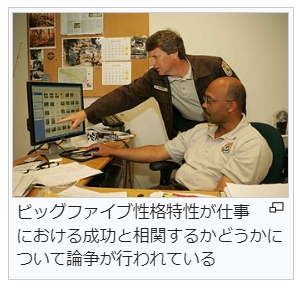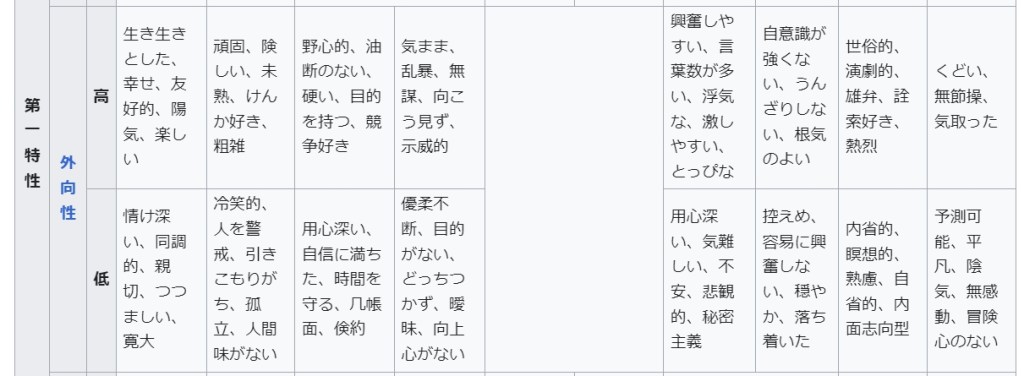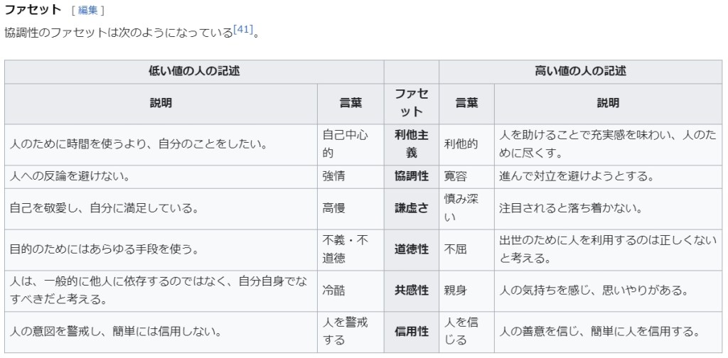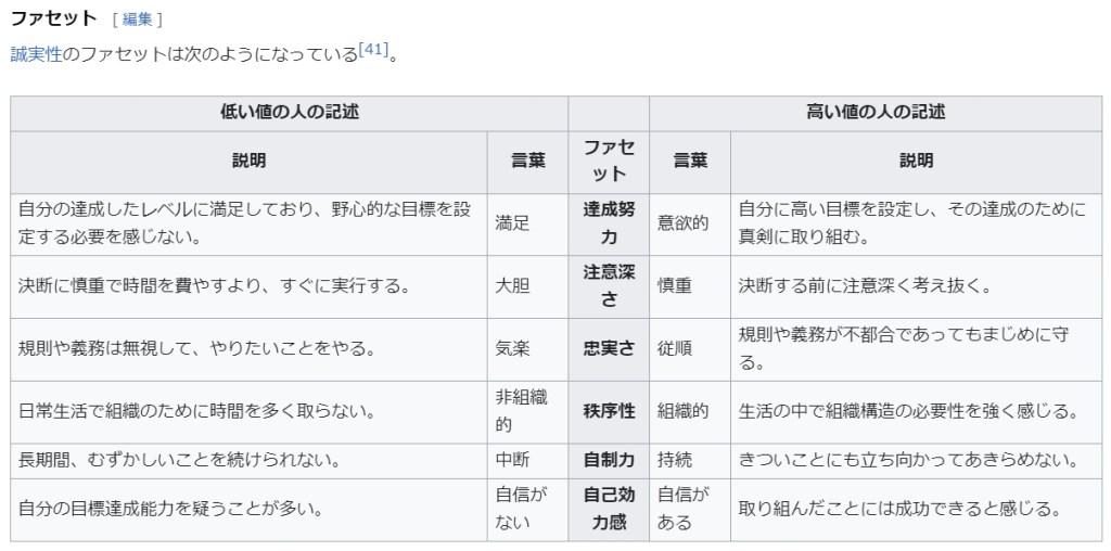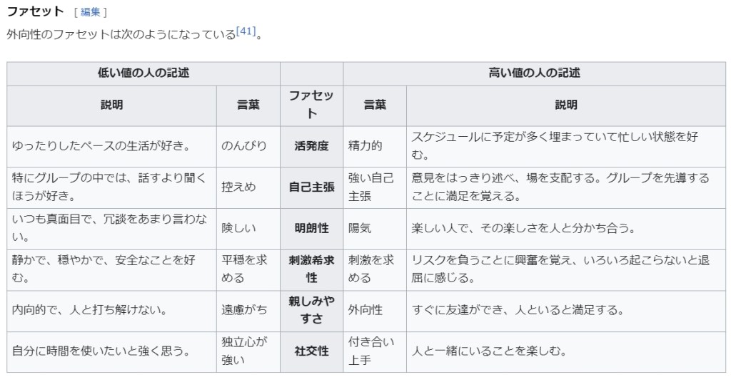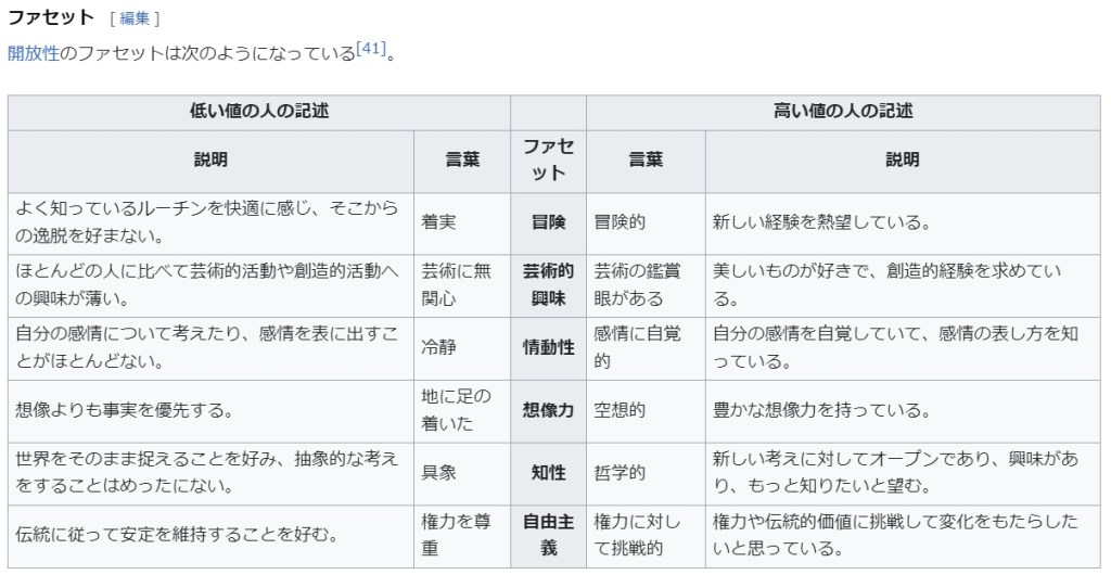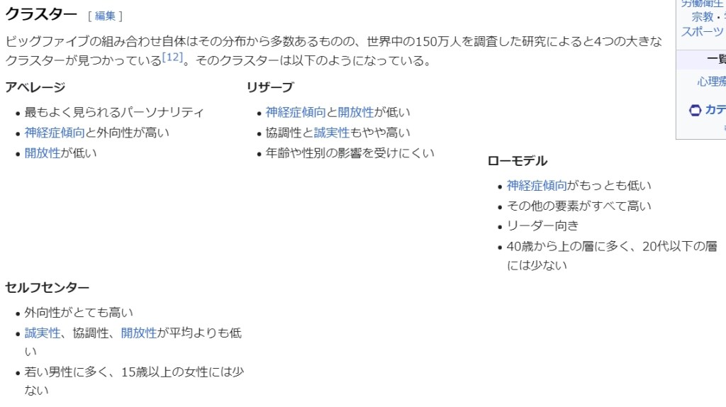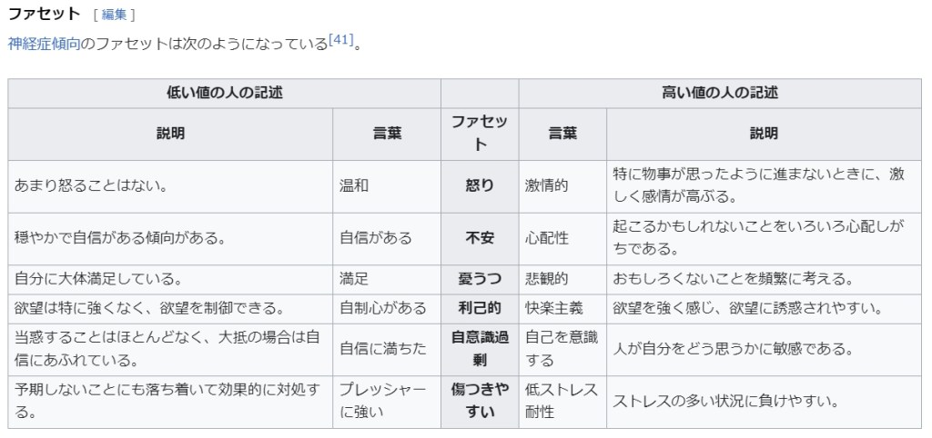 関連項目 ビッグファイブと文化(英語版) コア自己評価(英語版) DiSCアセスメント(英語版) ファセット(英語版) 目標志向(英語版) HEXACOモデル 道徳的基盤理論(英語版) MBTI 人格心理学 ソンディ・テスト(英語版) 特性理論 音楽選好の心理学 ビッグファイブ性格特性における相関リスト 『消費資本主義!』 参考文献 [脚注の使い方] ^ a b c “The big five personality dimensions and job performance”. SA Journal of Industrial Psychology 29. (24 October 2003). doi:10.4102/sajip.v29i1.88 2013年6月27日閲覧。. ^ a b c d e f 村上 宣寛, 村上 千恵子, 主要5因子性格検査の世代別標準化, 性格心理学研究, 公開日 2017/07/24, Online ISSN 2432-695X, Print ISSN 1345-3629, https://doi.org/10.2132/jjpjspp.8.1_32 ^ a b c d e f g h i 林 智幸 成人愛着スタイルとBigFive性格特性との関係性 ^ a b 『主要5因子性格検査ハンドブック 三訂版: 性格測定の基礎から主要5因子の世界へ』筑摩書房、2017年4月3日、ⅰ-ⅱ頁。ISBN 978-4480970190。 ^ a b “「学力は教育によって無限に開発できる」というのはフェイクニュース一般知能は77%という高い遺伝率を誇る「遺伝的な宝くじ」である[橘玲の日々刻々]”. diamond.jp (2019年1月31日). 2021年4月17日閲覧。 ^ a b “Optional Interview with Dr. Robert Bilder on Creativity and Problem Solving – What is Learning?”. Coursera. 2021年11月25日閲覧。 ^ “The structure of phenotypic personality traits”. The American Psychologist 48 (1): 26–34. (January 1993). doi:10.1037/0003-066x.48.1.26. PMID 8427480. ^ Revised NEO Personality Inventory (NEO-PI-R) and NEO Five-Factor Inventory (NEO-FFI) manual.. Odessa, FL: Psychological Assessment Resources. (1992) ^ Matthews, Gerald; Deary, Ian J.; Whiteman, Martha C. (2003). Personality Traits (2nd ed.). Cambridge University Press. ISBN 978-0-521-83107-9. オリジナルの2014-12-05時点におけるアーカイブ。 ^ a b c d e “How to become a better leader”. MIT Sloan Management Review 53 (3): 51–60. (2012). ^ Miller, Geoffrey. (2014). Spent : sex, evolution, and consumer behavior. Penguin Books. pp. 166-167. ISBN 978-1-101-05084-2. OCLC 883347860 ^ Gerlach, Martin; Farb, Beatrice; Revelle, William; Nunes Amaral, Luís A. (2018-09-17). “A robust data-driven approach identifies four personality types across four large data sets”. Nature Human Behaviour 2 (10): 735–742. doi:10.1038/s41562-018-0419-z. ISSN 2397-3374. ^ “Big Five Personality Dimensions: Characteristics of Individuals with High- and Low-Value Combinations of Dimensions”. web.archive.org (2018年11月26日). 2019年11月25日閲覧。 ^ Hirsh, Jacob B.; DeYoung, Colin G.; Peterson, Jordan B. (2009). “Metatraits of the Big Five Differentially Predict Engagement and Restraint of Behavior” (英語). Journal of Personality 77 (4): 1085–1102. doi:10.1111/j.1467-6494.2009.00575.x. ISSN 1467-6494. ^ a b Fast, Lisa A.; Funder, David C. (2008-02). “Personality as manifest in word use: correlations with self-report, acquaintance report, and behavior”. Journal of Personality and Social Psychology 94 (2): 334–346. doi:10.1037/0022-3514.94.2.334. ISSN 0022-3514. PMID 18211181. ^ a b Gill, Alastair J., Scott Nowson, and Jon Oberlander. What Are They Blogging About? Personality, Topic and Motivation in Blogs. AAAI Publications, Third International AAAI Conference on Weblogs and Social Media (2009): pp. 18-25. ^ a b c Golbeck, Jennifer; Robles, Cristina; Edmondson, Michon; Turner, Karen (2011-10-01). Predicting Personality from Twitter. pp. 149–156. doi:10.1109/PASSAT/SocialCom.2011.33. ^ a b Hirsh, Jacob; Peterson, Jordan (2009-12-30). “Personality and Language Use in Self-Narratives”. Journal of Research in Personality 43: 524–527. doi:10.1016/j.jrp.2009.01.006. ^ a b Yarkoni, Tal (2010-06-01). “Personality in 100,000 Words: A large-scale analysis of personality and word use among bloggers”. Journal of research in personality 44 (3): 363–373. doi:10.1016/j.jrp.2010.04.001. ISSN 0092-6566. PMC 2885844. PMID 20563301. ^ “Personality: what makes you the way you are”. Choice Reviews Online 45 (07): 45–4081-45-4081. (2008-03-01). doi:10.5860/choice.45-4081. ISSN 0009-4978. ^ Mondak, Jeffery J.. Personality and the Foundations of Political Behavior. Cambridge: Cambridge University Press. pp. xv–xvi. ISBN 978-0-511-76151-5 ^ Miller, Geoffrey. (2014). Spent : sex, evolution, and consumer behavior. Penguin Books. ISBN 978-1-101-05084-2. OCLC 883347860 ^ “Psychology of Criminal Conduct”. The SAGE Encyclopedia of Criminal Psychology (2455 Teller Road, Thousand Oaks, California 91320: SAGE Publications, Inc.). (2019). ISBN 978-1-4833-9226-4. ^ Kern, Margaret L.; Eichstaedt, Johannes C.; Schwartz, H. Andrew; Dziurzynski, Lukasz; Ungar, Lyle H.; Stillwell, David J.; Kosinski, Michal; Ramones, Stephanie M. et al. (2013-12-08). “The Online Social Self” (英語). Assessment 21 (2): 158–169. doi:10.1177/1073191113514104. ISSN 1073-1911. ^ a b Arnoux, Pierre-Hadrien; Xu, Anbang; Boyette, Neil; Mahmud, Jalal; Akkiraju, Rama; Sinha, Vibha (2017-04-18). “25 Tweets to Know You: A New Model to Predict Personality with Social Media”. arXiv:1704.05513 [cs]. ^ a b Schwartz, H. Andrew; Eichstaedt, Johannes C.; Kern, Margaret L.; Dziurzynski, Lukasz; Ramones, Stephanie M.; Agrawal, Megha; Shah, Achal; Kosinski, Michal et al. (2013-09-25). “Personality, Gender, and Age in the Language of Social Media: The Open-Vocabulary Approach” (英語). PLOS ONE 8 (9): e73791. doi:10.1371/journal.pone.0073791. ISSN 1932-6203. PMC 3783449. PMID 24086296. ^ a b Plank, Barbara, and Dirk Hovy. Personality Traits on Twitter -or- How to Get 1,500 Personality Tests in a Week. Proceedings of the 6th Workshop on Computational Approaches to Subjectivity, Sentiment and Social Media Analysis (WASSA 2015) (Se