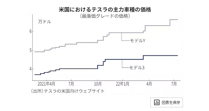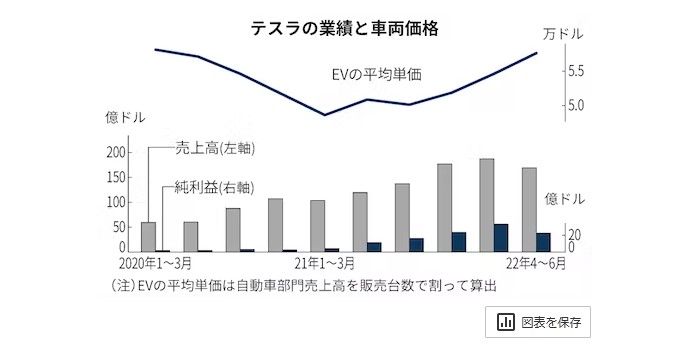 テスラの2021年12月期通期の売上高は前年同期比71%増の538億2300万ドルで、売上高営業利益率は同5.8ポイント増の12.1%だった。22年1~3月期の営業利益率は19.2%、4~6月期は14.6%。10%を超えれば御の字とされる製造業においては高収益企業といえる。