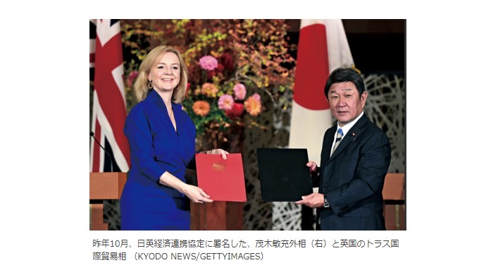 昨年10月、日英経済連携協定に署名した、茂木敏充外相(右)と英国のトラス国際貿易相 (KYODO NEWS/GETTYIMAGES) 重要なのは「汎地球的」ルール もちろん、デヴィッド・リカードの言う貿易における「比較優位」の原則(編集部注・貿易においては自国の得意な生産に特化したほうが効果的)は、相違から生まれる利益に基づく。だが最近になって、輸入(類似製品の輸入も含む)を通じて競争やイノベーションを高めるというヨーゼフ・シュンペーターの主張(「共争」)がヨーロッパで優勢になりつつあり、徐々に東アジアにも広がっている。