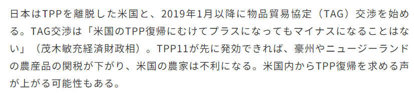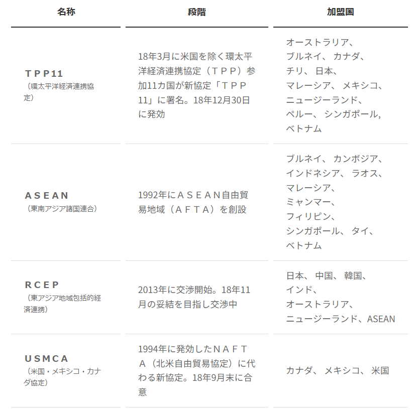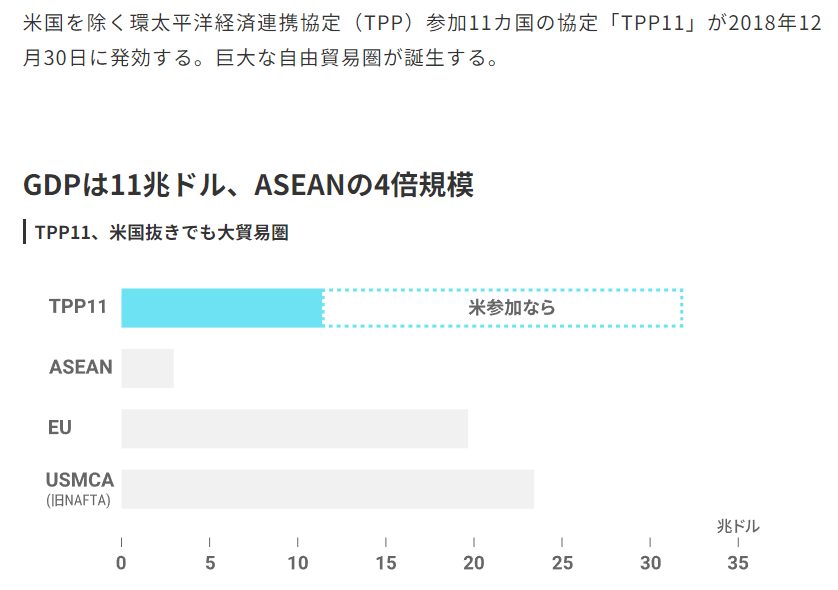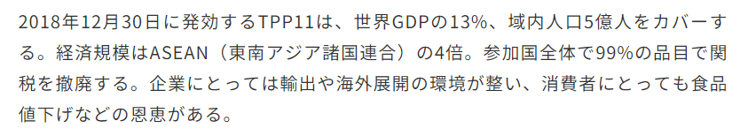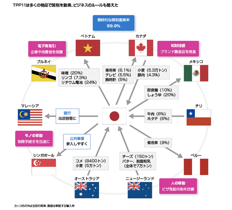 なお、TPP11は、米国を含めた12カ国で2016年2月に署名された「環太平洋パートナーシップ協定(TPP)」を基礎としています。