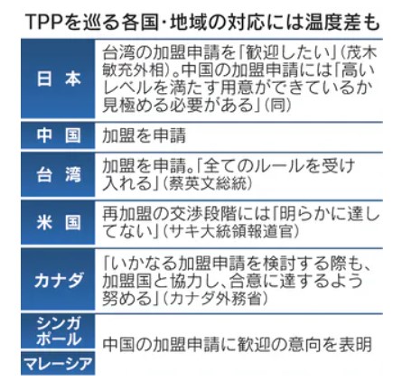 中国側は中国大陸と台湾が1つの国に属するという「一つの中国」を唱える。台湾の加盟を阻止するため、関係国への外交的な圧力を強める公算が大きい。TPP参加国は自由なルールの堅持で結束を堅持できるかどうかが試される。