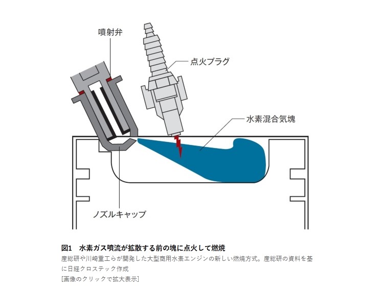 産総研や川崎重工らが開発した大型商用水素エンジンの新しい燃焼方式。産総研の資料を基に日経クロステック作成 [画像のクリックで拡大表示]