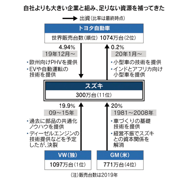 スズキはこれまでも米ゼネラル・モーターズ(GM)など同業大手と組みながら、独立を保ってきた。だが買収でスズキをのみ込もうとしたVWとは11~15年まで約4年間にわたる裁判に発展した。CASE時代にスズキの立場を尊重し、庇護(ひご)してくれる存在は誰なのか。たどり着いた答えが、創業家同士が縁のあるトヨタだった。