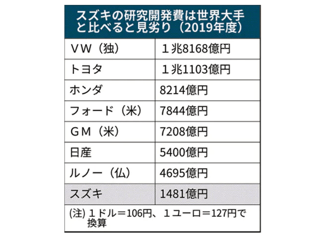 自動車業界は電動化や自動運転など「CASE」と呼ばれる100年に1度の大変革を迎えている。この変化に対応するには巨額の投資が必要だ。だがスズキの研究開発費は2019年度で1481億円。独フォルクスワーゲン(VW)の1兆8000億円超などと比べると見劣りする。