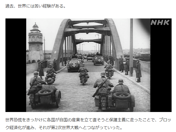 世界恐慌をきっかけに各国が自国の産業を立て直そうと保護主義に走ったことで、ブロック経済化が進み、それが第2次世界大戦へとつながっていった。