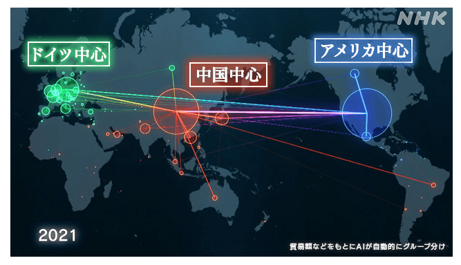 それぞれの国がどの国と関係が近いのか、貿易額だけでなく、関係性の深さなどをAIが判別。グループ分けをした。