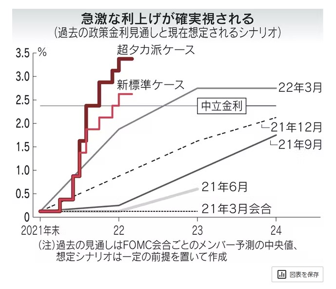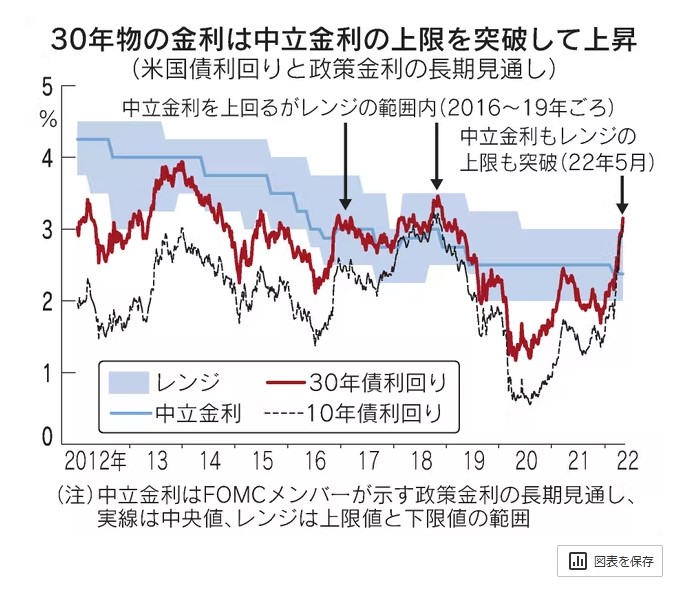 セントルイス連銀のブラード総裁が言及した0.75%の利上げも織り交ぜる超タカ派ケースだと、ブラード氏の主張どおり年末の政策金利は3.5%に近づく。30年物金利が中立水準の上限を突破したのは、市場が超タカ派ケースも視野に急激な利上げを織り込みつつあると解釈できる。