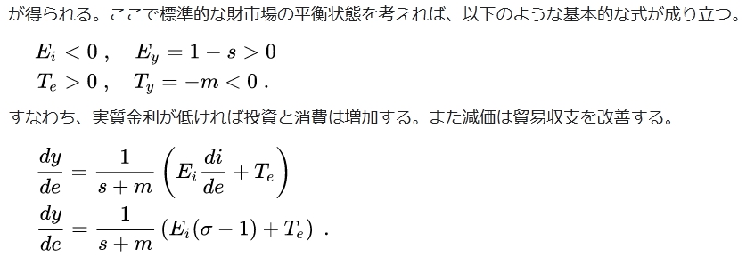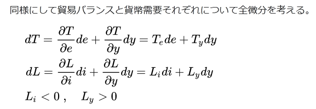 となる。国内の所得水準 y {\displaystyle y}は y = E ( i , y ) + T ( e , y ) {\displaystyle y=E(i,y)+T(e,y)} であり、これを為替レートに関して微分してやると