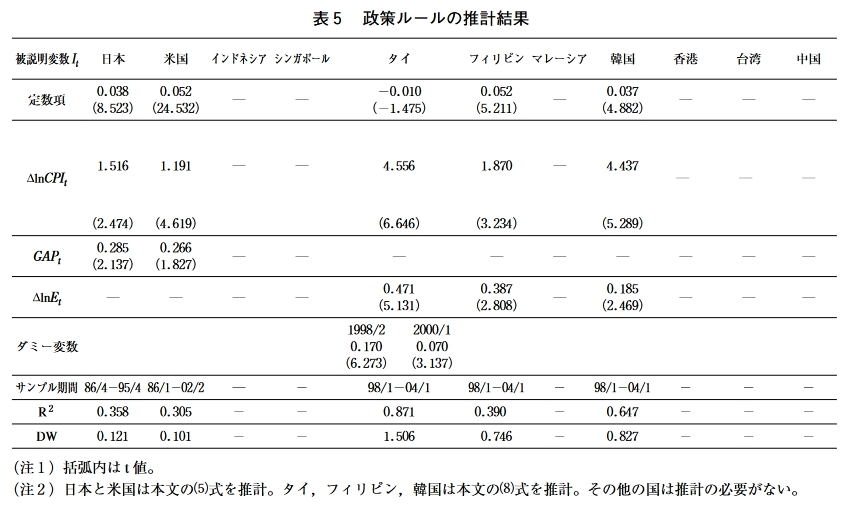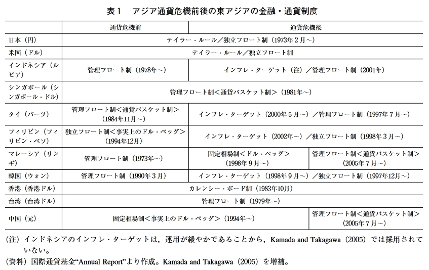 したがって,タイ当局には,現行レジームから 他の政策レジームに移行するインセンティブは なく,現行レジームは安定的であると考えるこ とができる。 フィリピンは,現在インフレ•ターゲットを 採用しているが,表9が示すように,ここから 移行することによって,なんらゲインはなく, 現行の政策レジームは安定的であると解釈する ことができる。ただ,アジア通貨危機を自然実 験として用いた際,本稿のアプローチでは,フ イリピンのレジーム変更を合理的に説明するこ とができなかったことを想起されたい。このこ とは,フィリピンの制度変更が,本稿のアプロ ーチで捉え切れていない別の要因によって決定 されたことを示唆している。したがって,ここ での結果をもって,フィリピンの現行レジーム が絶対に安定的であるとは言い切れない。 マレーシアは,アジア通貨危機後に,通貨バ スケット制から事実上のドル・ペッグ制へと移 行した。しかし,先の議論では,こうしたレジ ーム変更を合理的に説明するインセンティブを 見出すことはできなかった。この点は,シナリ 才2や3についても同じである。さらに,ここ には掲載されていないが,通貨バスケット制と インフレ・ターゲットを比較したところ,シナ リオ2のインフレ率を除いて,通貨バスケット 制の方がインフレ・ターゲットよりも安定化効 果が高いことがわかっている。マレーシア当局 が,2005年7月に,ドル・ペッグ制を放棄し, インフレ・ターゲットではなく,通貨バスケッ 卜制を採用した背景には,こうした合理的な判 断があったと推測される。 韓国は,アジア通貨危機を境に従来の管理フ ロート制からインフレーション・ターゲットへ と移行し,そうしたレジーム変更の背景には通 貨危機から自国の経済安定性を守るという合理 的判断があったことがわかっている。問題は, この先,韓国が引き続きインフレ・ターゲット を維持するのかという点である。シナリオ3の 結果をみると,通貨バスケット制の下で貿易収 支が安定化する以外,いずれの代替レジームへ 移行しようとも,経済の安定性を高めることは できない。しかし,シナリオ2が発生する場合 には,ドル・ペッグ制か通貨バスケット制へ移 行することによって,3つの指標全てを安定化 することができる。したがって,米国経済が不 安定化するような事態になれば,韓国の政策レ ジームが再び流動化する可能性は高い。 香港は,アジア通貨危機に際して,現行のカ レンシーボード制を維持した。シナリオ1の結 果をみると,香港は,通貨バスケット制を採用 -123 – 東アジアにおける通貨制度の安定性 していれば,3つの指標全てを安定化させるこ とができたはずである。したがって,香港は, 通貨危機ショックよりも,別のショックをより 重視していたと推察される。シナリオ2と3の 結果をみてみよう。香港がインフレ•ターゲッ 卜を採用することはない。逆に,通貨バスケッ 卜制を採用すると,シナリオ2の貿易収支を除 いて,ほとんどのケースで経済が安定化してい る。したがって,香港が通貨バスケットへ移行 する確率はかなり高い。ただ,香港のような貿 易立国が貿易収支の変動を重視することに何ら 不思議はなく,この場合,同国が通貨バスケッ 卜制へ移行するインセンティブは小さい。 台湾はアジア通貨危機に際しても,管理フ口 ート制を維持し続けた。しかし,シナリオ1の 結果によると,台湾は,通貨バスケット制やイ ンフレ・ターゲットを採用することによっ て,3つ全ての経済指標を安定化させることが できたはずである。これは,台湾が別のショッ クを重視していたことを示唆している。シナリ 才2と3の結果をみると,台湾には,ドル・ぺ ッグ制を採用するインセンティブが全くないこ とがわかる。また,通貨バスケット制を採用す ると,シナリオ2と3の下では,物価は安定化 するが,景気と貿易は不安定化する。インフレ •ターゲットを採用すれば,シナリオ3の下で は,3指標全てを安定化させることができるが, シナリオ2の下では,物価が安定化する一方で, 景気と貿易が不安定化する。このように,台湾 の政策レジームの安定性は,金融当局がどのシ ョックを最も警戒しており,どの経済指標を安 定化させようと考えているかということに依存 して区々である。 中国は,1997年の通貨危機に際しても,事実 上のドル・ペッグ制を放棄しなかった。しかし, シナリオ1の結果をみると,中国は,通貨バス ケット制へ移行することによって,3つの指標 全てを安定化させることができたはずである。 このことは,中国が,通貨危機ショックよりも, 別のショックをより重視していたことを示唆し ている。次に,シナリオ2と3の結果をみると, どのレジームへ移行しようと,いかなる指標も 安定化できないことがわかる。したがって,少 なくともここでのシナリオを前提とする限り, 中国がレジーム変更するインセンティブは見当 たらない。実際,2005年に通貨バスケット制の 導入を宣言したものの,人民元の対ドル相場は ほとんど変化していないのが実情であ