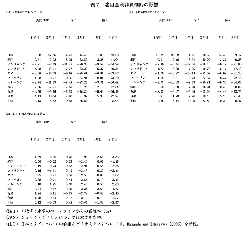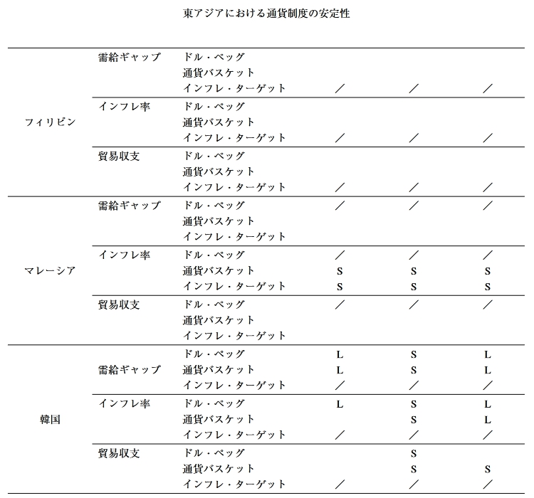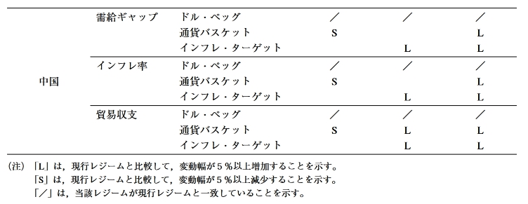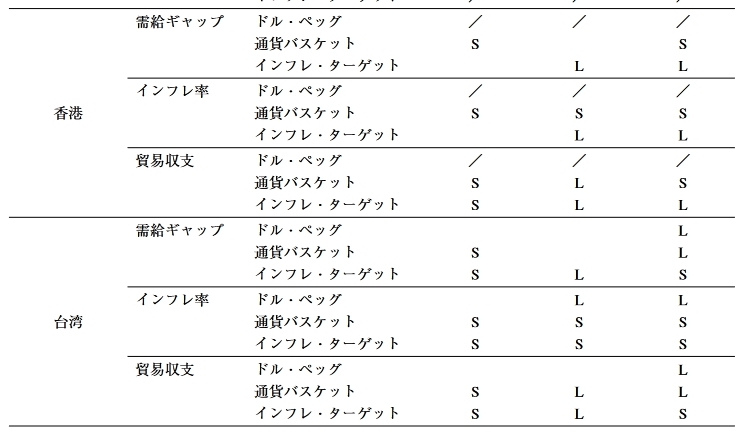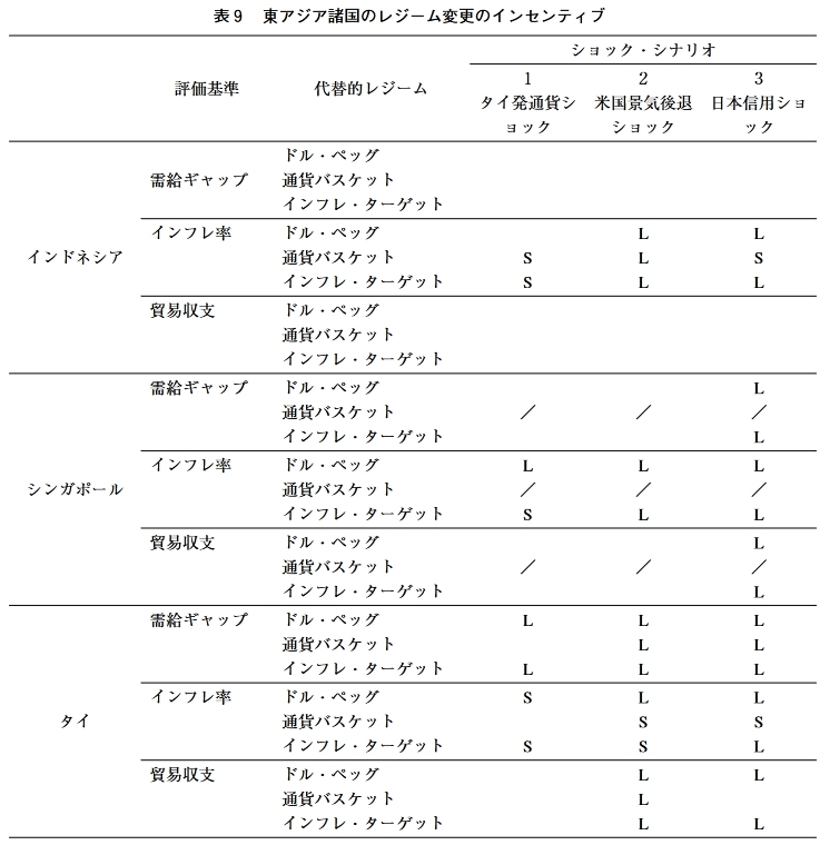 しかし,4ケ国中3ヶ国における政策レ ジームの変更を予想できていることから考えて, 本稿のアプローチは十分現実妥当性を備えたも 表9 東アジア諸国のレジーム変更のインセンティブ シ ヨック・シナリオ 評価基準 代替的レジーム 1 2 3 タイ発通貨シ 米国景気後退 日本信用ショ ヨック ショツク ック ドル•ペッグ 需給ギャップ 通貨バスケット インフレ・ターゲット インフレ率 ドル•ペッグ L L インドネシア 通貨バスケット S L S インフレ・ターゲット S L L 貿易収支 ドル•ペッグ 通貨バスケット インフレ・ターゲット 需給ギャップ ドル•ペッグ L 通貨バスケット / / / インフレ・ターゲット L インフレ率 ドル•ペッグ L L L シンガポール 通貨バスケット / / / インフレ・ターゲット S L L 貿易収支 ドル•ペッグ L 通貨バスケット / / / インフレ・ターゲット L 需給ギャップ ドル•ペッグ L L L 通貨バスケット L L インフレ・ターゲット L L L インフレ率 ドル•ペッグ S L L タイ 通貨バスケット S S インフレ・ターゲット S S L 貿易収支 ドル•ペッグ L L 通貨バスケット L インフレ・ターゲット L L -120- 東アジアにおける通貨制度の安定性 需給ギャップ ドル•ペッグ 通貨バスケット インフレ・ターゲット / / / インフレ率 ドル•ペッグ フィリピン 通貨バスケット インフレ・ターゲット / / / 貿易収支 ドル•ペッグ 通貨バスケット インフレ・ターゲット / / / 需給ギャップ ドル•ペッグ 通貨バスケット インフレ・ターゲット / / / インフレ率 ドル•ペッグ / / / マレーシア 通貨バスケット S S S インフレ・ターゲット S S S 貿易収支 ドル•ペッグ 通貨バスケット インフレ・ターゲット / / / ドル•ペッグ L S L 需給ギャップ 通貨バスケット L S L インフレ・ターゲット / / / インフレ率 ドル•ペッグ L S L 韓国 通貨バスケット S L インフレ・ターゲット / / / 貿易収支 ドル•ペッグ S 通貨バスケット S S インフレ・ターゲット / / / 需給ギャップ ドル•ペッグ / / / 通貨バスケット S S インフレ・ターゲット L L インフレ率 ドル•ペッグ / / / 香港 通貨バスケット S S S インフレ・ターゲット L L 貿易収支 ドル•ペッグ / / / 通貨バスケット S L S インフレ・ターゲット S L L 需給ギャップ ドル•ペッグ L 通貨バスケット S L インフレ・ターゲット S L S インフレ率 ドル•ペッグ L L 台湾 通貨バスケット S S S インフレ・ターゲット S S S 貿易収支 ドル•ペッグ L 通貨バスケット S L L インフレ・ターゲット S L S -121- 東アジアにおける通貨制度の安定性 需給ギャップ ドル•ペッグ / / / 通貨バスケット S L インフレ・ターゲット L L インフレ率 ドル•ペッグ / / / 中国 通貨バスケット S L インフレ・ターゲット L L 貿易収支 ドル•ペッグ / / / 通貨バスケット S L L インフレ・ターゲット L L (注)「むは,現行レジームと比較して,変動幅が5 %以上増加することを示す。 「S」は,現行レジームと比較して,変動幅が5 %以上減少することを示す。 r/jは,当該レジームが現行レジームと一致していることを示す。