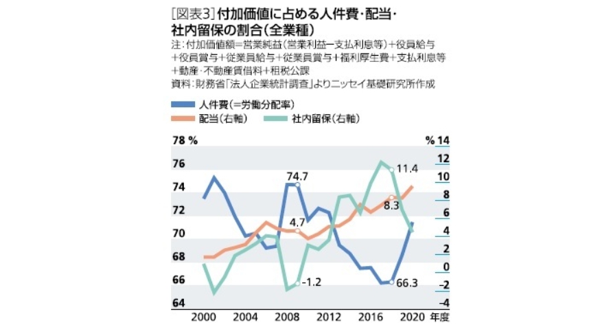 [図表3]付加価値に占める人件費・配当・社内留保の割合(全業種)