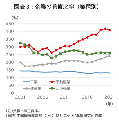 また、20年から始まった債務管理強化の背景でもある不動産デベロッパーの高レバレッジは、金融リスクの温床であり、解消の必要性が高い。不動産業の負債比率は、2010年代半ばから目立って上昇を続けている(図表3)。