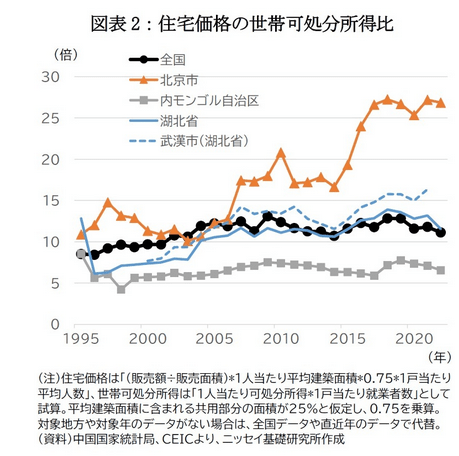 加えて、地方による差が顕著だ。例えば、22年時点で水準が最も高い北京では25倍を超える水準で高止まりしている一方、最も低い内モンゴル自治区では7倍前後の水準である。