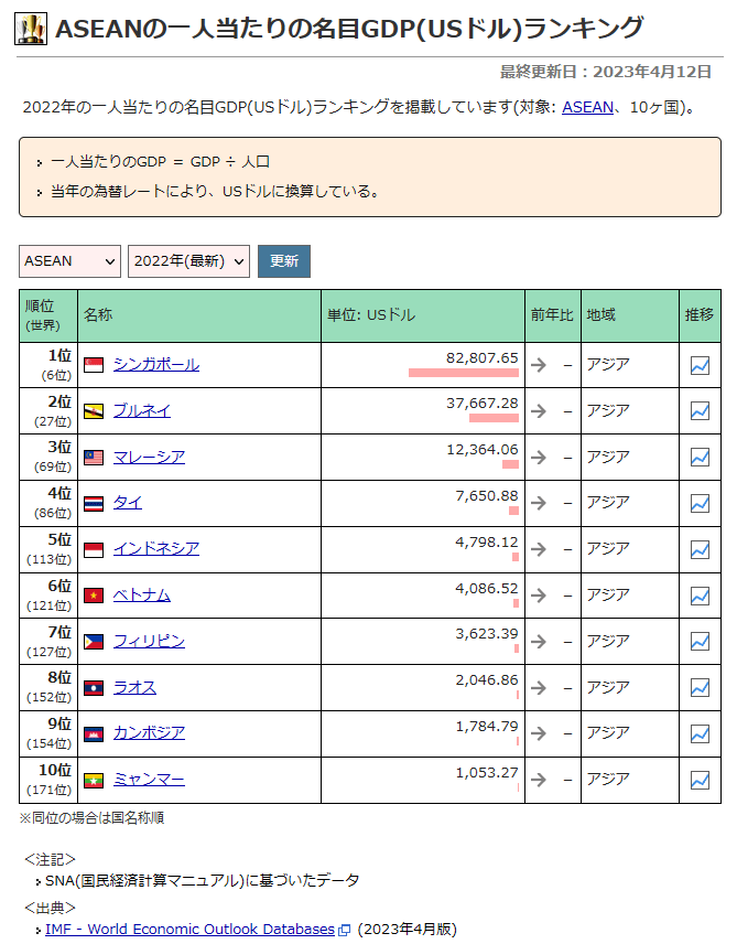 ASEANの一人当たりの名目GDP(USドル)ランキング