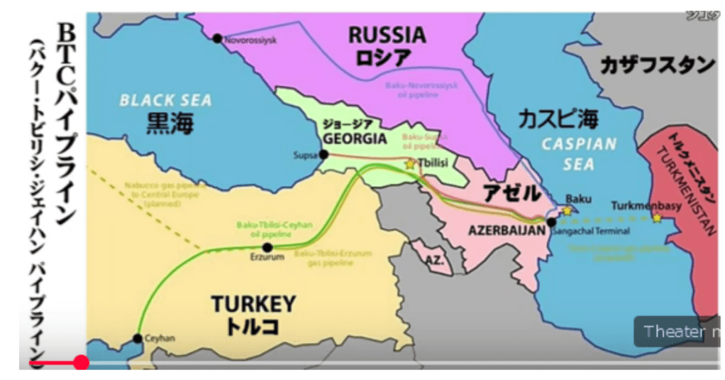 港を持たないカザフスタンはこれまで、石油タンカーでバクーBakuまで運び、図のBTCパイプライン(青い線)でロシアを経由して黒海から輸出していたが、パイプラインでアゼルバイジャン経由でトルコの港まで送ってからタンカーで輸出するルートに切り替え「脱ロシア化」を進めていると説明されている。